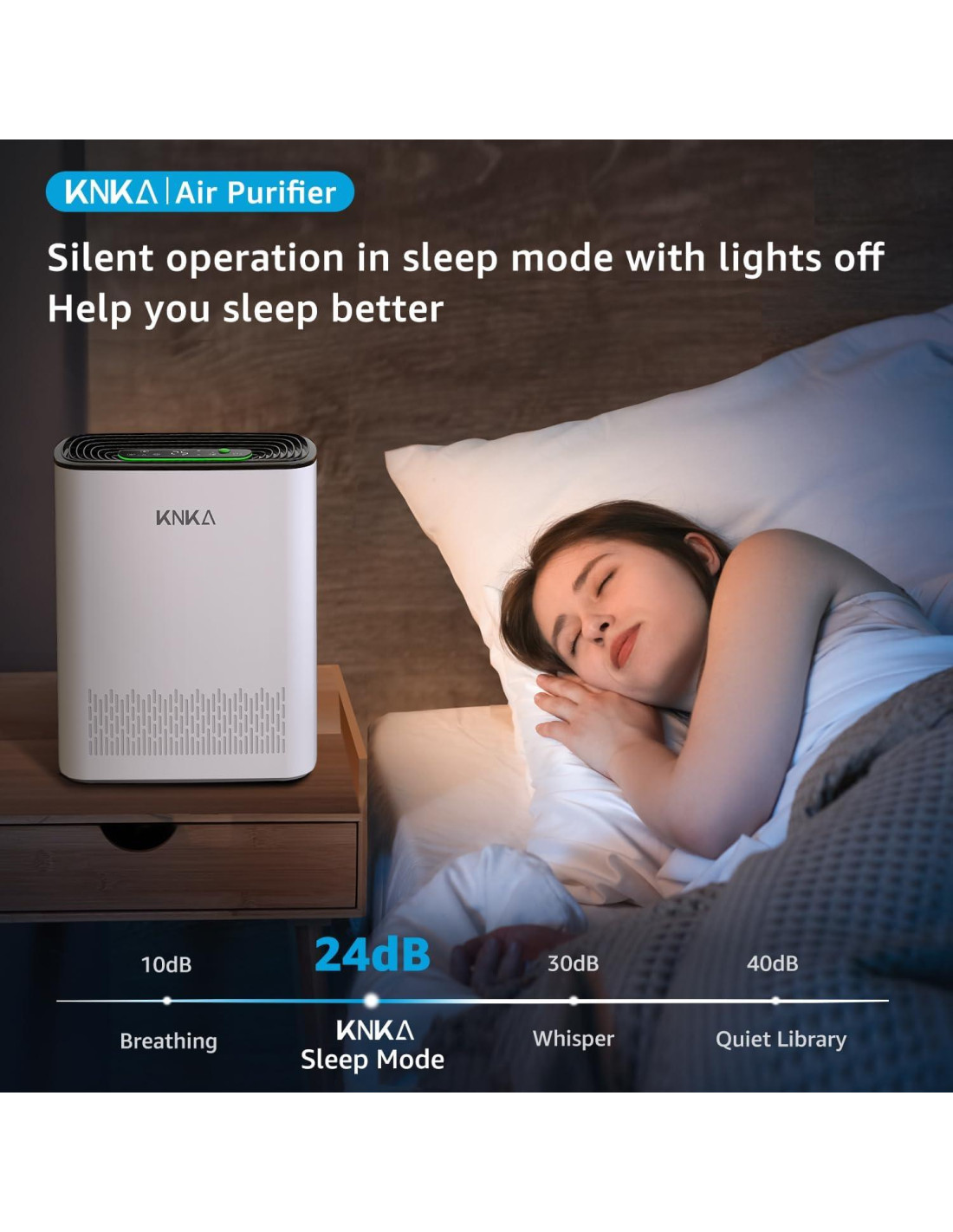 - Purifica Espacios de Hasta 2325 Pies Cuadrados (216.1 m) Sin Esfuerzo: El purificador de aire HEPA verdadero de KNKA está diseñado para dormitorios, salas de estar, oficinas y áreas abiertas grandes. Su potente ventilador y sistema de circulación eliminan rápidamente los contaminantes en el aire, asegurando aire fresco para su familia en cualquier entorno.