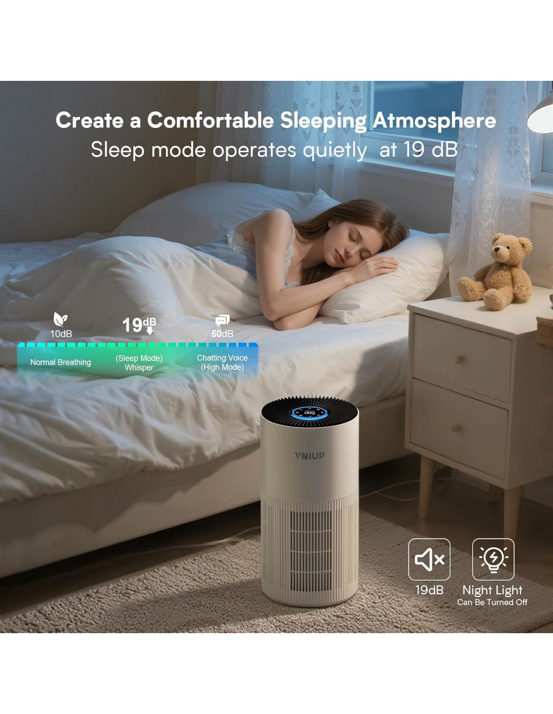 - [Modo de Sueño y Luz Nocturna] : Con un motor avanzado y un nivel de ruido casi silencioso de 19DB en modo de sueño, este purificador de aire es adecuado para habitaciones grandes y pequeñas en el hogar y puede purificar el aire silenciosamente sin afectar tu trabajo, estudio o sueño. La luz nocturna es opcional y se puede apagar para crear un ambiente de sueño perfecto, silencioso y relajante.