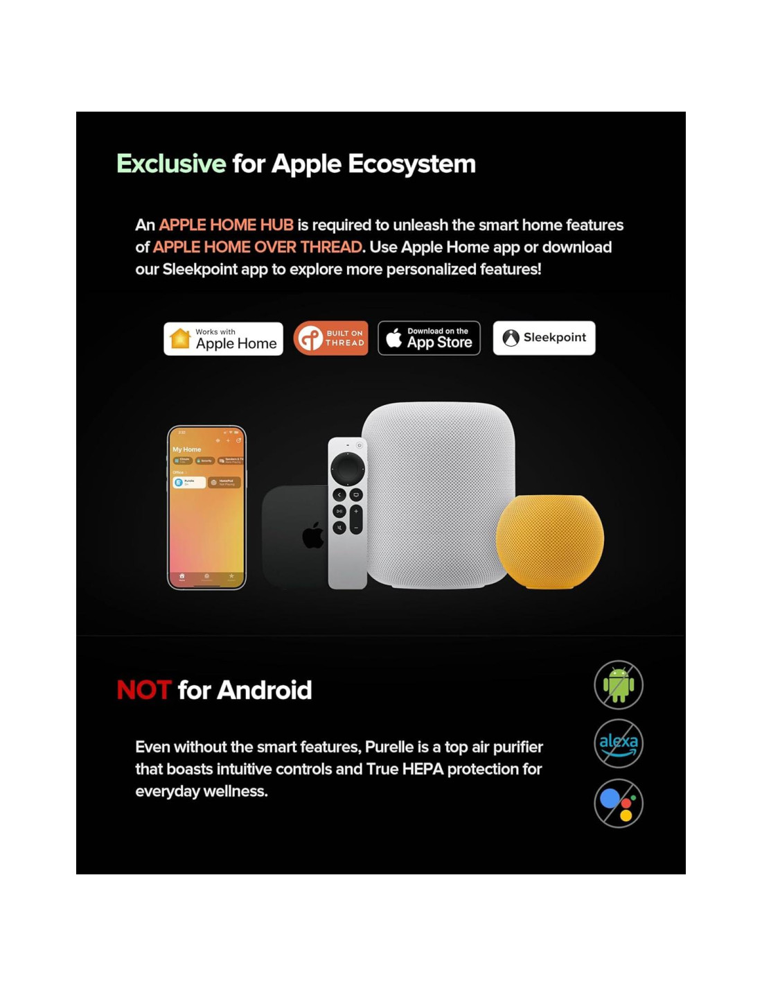 - PURIFICADORES DE AIRE A PRUEBA DE FUTURO CON HOMEKIT Pide a Siri que encienda/apague el purificador; controla la velocidad del ventilador, así como informa la calidad del aire en tiempo real; Se conecta usando : la red de malla inalámbrica que es más confiable, receptiva, estable y segura. Se requiere un HomPod mini u otro hub doméstico para el acceso remoto de Siri y la funcionalidad de Thread; NO SE REQUIERE HUB ADICIONAL