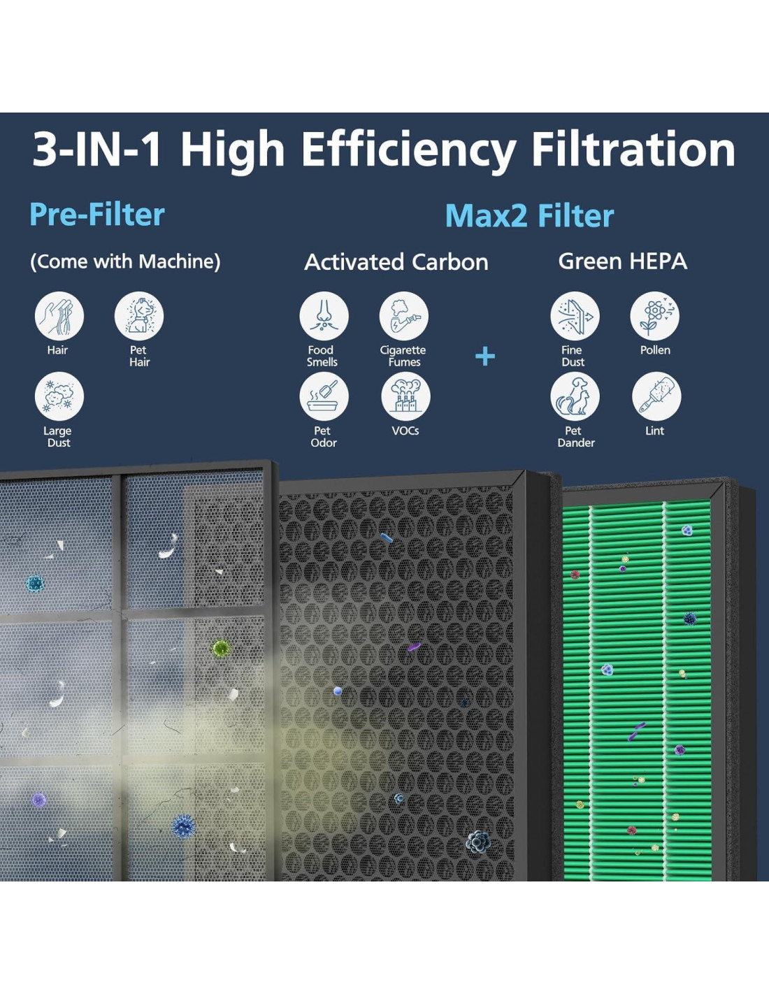 - DOS EN UNO: Los filtros HEPA 400 400S para Coway AIRMEGA Max2 pueden atrapar el 99.7% del polen, pelusa, caspa de mascotas y fibras de tela. El Filtro de Carbón Activo puede eliminar más del 99.7% de los olores de mascotas, cocina, cigarrillos, así como compuestos orgánicos volátiles.