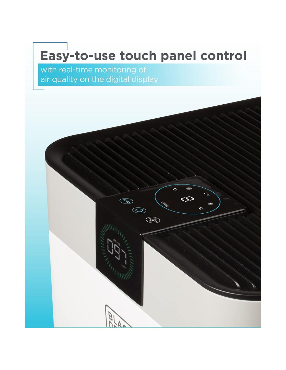 El Purificador de Aire Precipitador Electrostatico BLACK+DECKER con tecnología UV avanzada es un purificador de aire de última generación meticulosamente diseñado para hogares grandes e incluso espacios comerciales, lo que lo convierte en una opción ideal para quienes buscan soluciones integrales de purificación de aire para su hogar. Con su robusto sistema de filtración de 4 etapas, este purificador de aire asegura que disfrutes de una calidad de aire inigualable en espacios de hasta 234.3 m, basado en 5 cambios de aire por hora. Comienza con el Pre-filtro, que captura partículas más grandes como polvo y pelo de mascotas, protegiendo los filtros posteriores y prolongando su eficiencia. A continuación, el Precipitador Electrostatico utiliza carga electrostática para eliminar partículas finas como polvo, moho, esporas, virus, polen y alérgenos. Un filtro de Ozono previene las emisiones de ozono y otras partículas en el aire de entrar en tu hogar. El filtro combinado HEPA/Carbón Activado entra en juego, hábil en eliminar micropartículas en el aire como alérgenos, ácaros del polvo y caspa de mascotas tan pequeñas como 0.7 micrones. Añadiendo a su impresionante repertorio, la función Anión emite iones negativos, sirviendo como un purificador de aire iónico que se adhiere a las partículas de polvo permitiendo que se adhieran fácilmente al filtro HEPA cargado. Nuestra innovadora tecnología UV-LED incorporada en este purificador de aire reduce la presencia de moho y bacterias, protegiendo el ambiente de tu hogar. Con un CADR promedio AHAM de 340 CFM y otras calificaciones (309 Polvo, 387 Polen, 324 Humo), nuestros purificadores de aire para el hogar son eficientes y efectivos, asegurando una rápida purificación de tus espacios vitales. Nuestros purificadores de aire HEPA para el hogar también cuentan con un panel de control táctil con pantalla digital, función de modo de sueño y monitoreo en tiempo real de la calidad del aire. Cable de alimentación de 1.83 m. Filtro de reemplazo AF5 se vende por separado.
