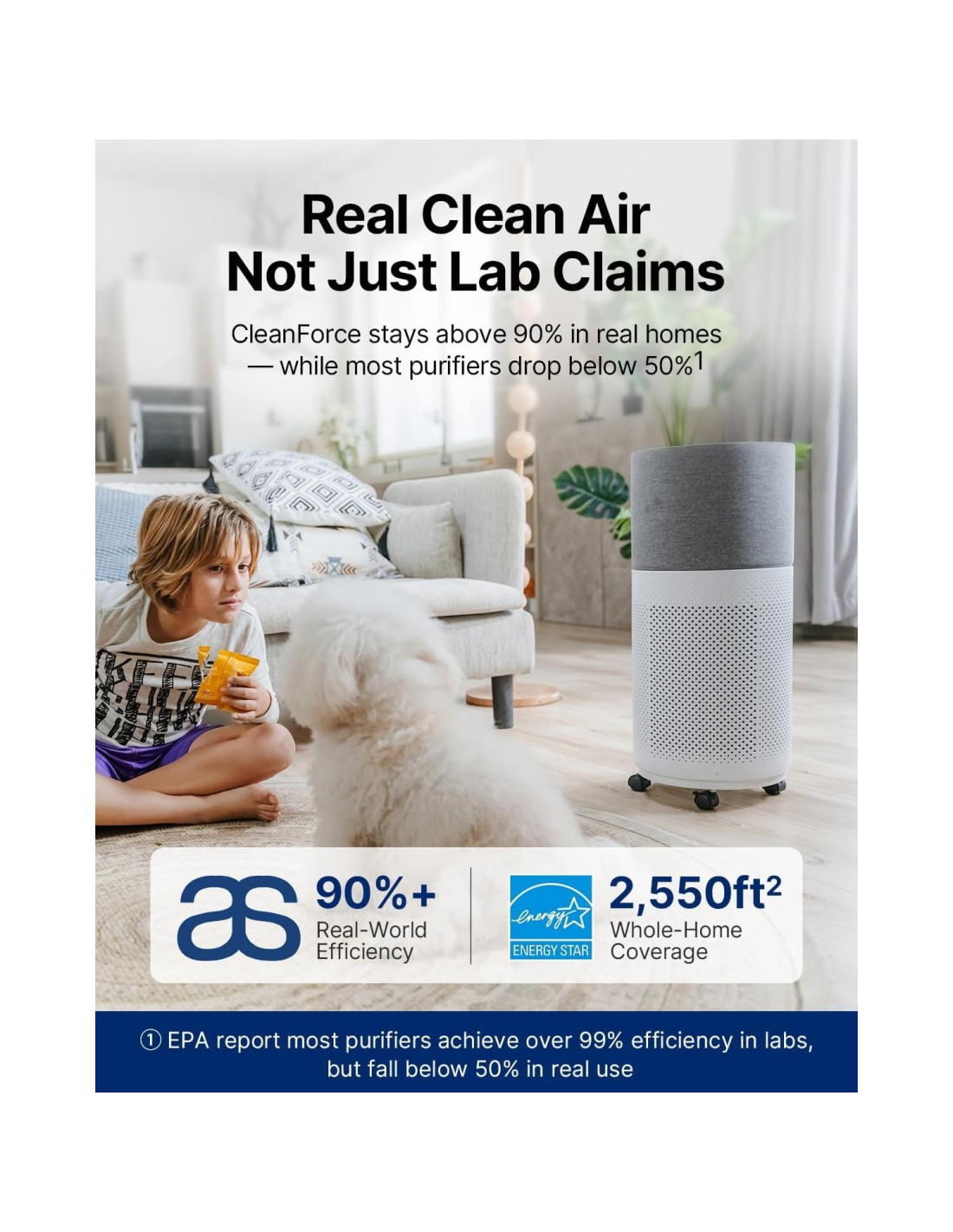 - Lab-Tested & Real-World Proven Performance El purificador de aire CleanForce elimina el 99.99% de los contaminantes en pruebas de laboratorio y mantiene una eficiencia del 90%+ en el hogar real (SGS)-a diferencia de la mayoría de los purificadores que caen por debajo del 50% en uso real.