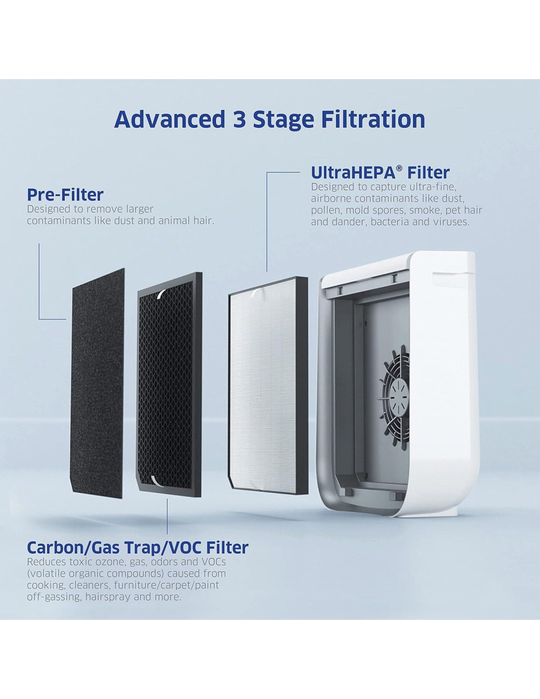 - Sistema de filtración de aire superior: Nuestros filtros UltraHEPA HEPA han demostrado capturar el 99.99% de las partículas en el aire hasta 0.003 micrones de tamaño, 100 veces más pequeños que los estándares HEPA.