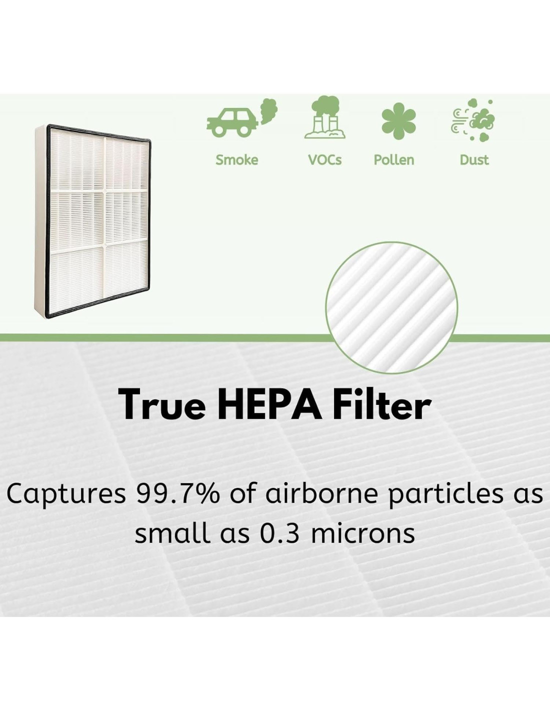 - Filtro HEPA de alta calidad captura el 99.97% de las partículas en el aire hasta 0.3 micrones. El Pre-filtro de carbón activado elimina cualquier olor doméstico desfavorable y atrapa el polvo.