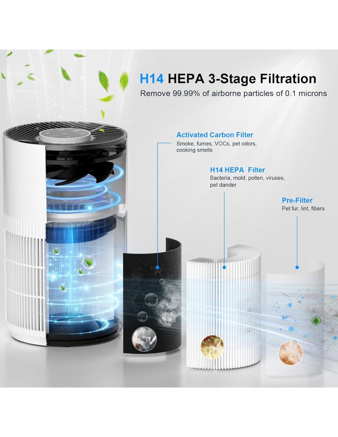 - [Compacto y Portátil] - El purificador de aire cuenta con un filtro HEPA H14, es beneficioso para dueños de mascotas, padres de recién nacidos, personas con asma y cualquier persona que busque aire limpio para respirar, el tamaño del purificador es 16.99 cm de diámetro x 16.99 cm de ancho x 28.09 cm de alto, recuerde sacar el enchufe y el manual de instrucciones en la parte inferior del purificador antes de usar.