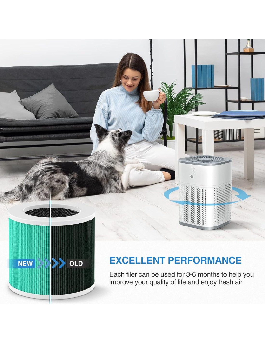 - FILTRO PRELIMINAR Y FILTRO DE CARBONO: El filtro preliminar fino filtra partículas grandes como polvo, pelusa, fibras, cabello, pelaje de mascotas y ayuda a extender la vida del filtro HEPA; El filtro de carbono mejorado con contenido de carbono doble absorbe eficientemente los olores domésticos de mascotas, cocina, humo, incendios forestales y compuestos orgánicos volátiles (COV)