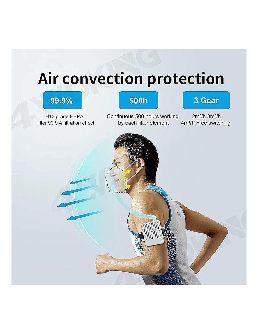 - Puedes conectar el filtro de aire eléctrico a cualquier lugar que desees, y luego opcionalmente atarlo a los brazos, cuello, cintura y cabeza.