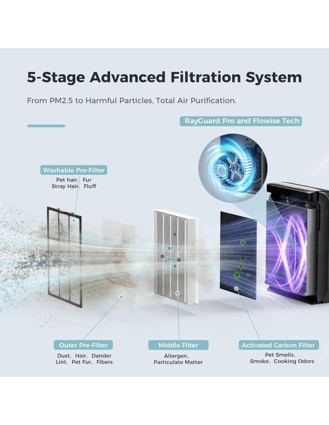 - Defensa Integral: Este purificador de aire, equipado con carbón activado y un pre-filtro, elimina eficazmente partículas y olores. El filtro captura caspa de mascotas y polen, mientras que el carbón activado neutraliza olores y humo. El filtro lavable incluido bloquea el pelo de mascotas, extendiendo su vida útil para una purificación integral