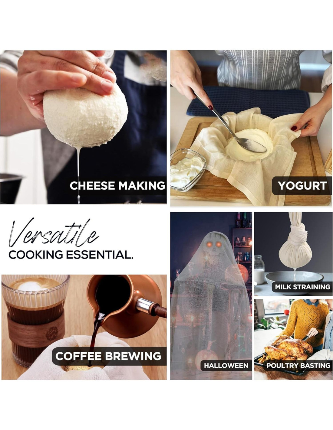 - MÚLTIPLES USOS EN EL HOGAR: El paño de queso se puede utilizar en una gran cantidad de aplicaciones domésticas y profesionales diferentes. Bolsas de especias, conservas, scoby de kombucha, queso, yogur y elaboración de vino, manteniendo el pollo o pescado intacto al escalfar, asar pavo o pollo, exprimiendo jugo de cítricos sin semillas, pulido de superficies finas, teñido, limpieza, desempolvado, decoración de Halloween, creación de fantasmas.