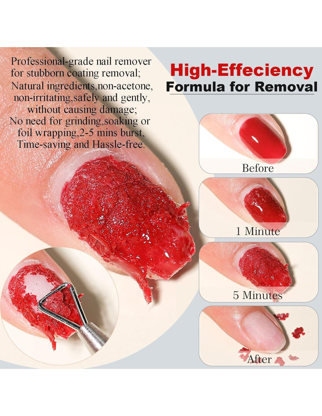 - [Proceso DIY Simple en 3 Pasos] 1) Lima la capa superior; 2) Aplica el removedor de gel para uñas de manera uniforme; 3) Espera 2-5 minutos, luego empuja suavemente el esmalte suavizado. Logra resultados de calidad de salón en casa con esta rutina fácil.