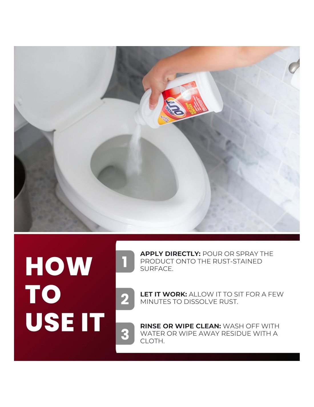 - FÓRMULA SIN FREGAR - El Polvo Quitamanchas de Óxido transforma químicamente las manchas de óxido en un estado claro y soluble, que se enjuaga fácilmente sin necesidad de fregar. Esta fórmula es perfecta para usar en inodoros, bañeras, duchas y suavizadores de agua.