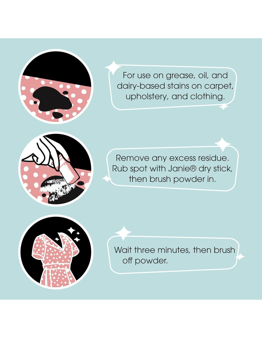 Cuando nada más ha funcionado en esa mancha aceitosa, ¡Janie Dry Spot Cleaner puede y lo hará! Fabricado en EE. UU. y confiable durante más de 60 años. Janie es parte del Colectivo de productos y marcas de Hickory Brands, Inc. HBi Collective es un fabricante OEM en constante evolución e innovador durante 100 años en las industrias de moda, accesorios, deportes, militar, técnico y artículos deportivos al aire libre. HBI fue fundado en 1923 como Hickory Lace Braiding Co. en un sótano en Hickory NC, con equipo de trenzado de segunda mano y mucho conocimiento fabricado en EE. UU. Gran parte de nuestra fabricación sigue siendo fabricada en EE. UU. mientras continuamos produciendo nuestros cordones de calidad y productos de limpieza en nuestras fábricas de Hickory NC. Era de propiedad familiar entonces, y sigue siendo de propiedad familiar hasta el día de hoy, incluso a medida que ha crecido con nuevas tecnologías de fabricación, nuevas marcas y líneas de productos. En la década de 1960, el poliéster estaba en auge para ropa de ocio, casual, danza y clubes, con colores más brillantes y patrones más audaces. Pero con ello vino la 'mancha misteriosa', donde las manchas aceitosa se unían a la tela y solo eran más visibles después de lavar. Afortunadamente, Janie fue inventada para absorber y levantar esas molestas manchas aceitosa. ¡El mismo gran producto que existía en la década de 1960 todavía se fabrica aquí en EE. UU.