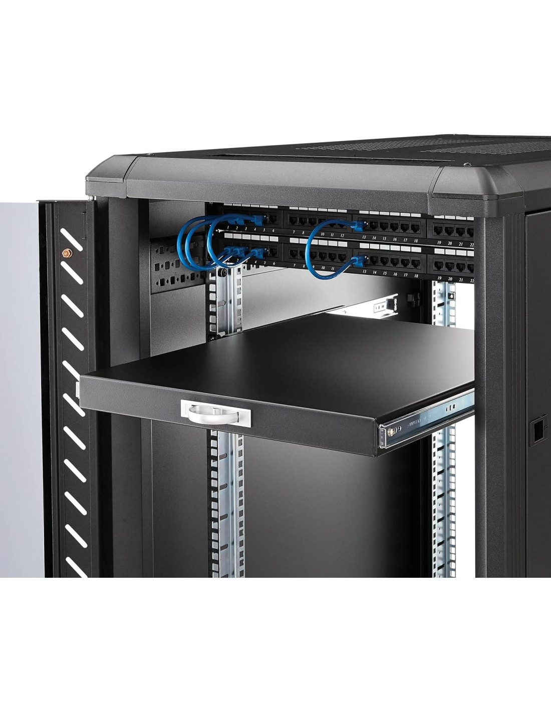 El estante deslizante para teclado de montaje en rack de servidor de 1U tiene 22in de profundidad y te permite agregar un estante deslizante 2 en 1 / bandeja para teclado que ayudará a mantener los costos bajos y la productividad alta. Su diseño versátil asegura que funcione perfectamente para todas tus necesidades de equipos informáticos, AV, de red y de datos; perfecto para profesionales de TI y negocios por igual. Construido con acero sólido, este duradero estante de rack extraíble puede soportar hasta 55 lb / 25 kg de equipo, siendo una solución perfecta para almacenar equipos pequeños que no son de montaje en rack, herramientas, periféricos o accesorios en tu rack o gabinete para mantenerlos fácilmente accesibles. La robusta construcción de acero soporta incluso los entornos industriales más duros, ayudando a mantener tu equipo seguro. A medida que cambian las necesidades de tu gabinete de servidor, la bandeja de rack de servidor versátil se adapta permitiéndote usarla como un estante deslizante resistente, o un cajón extraíble de 1U con una capacidad de peso de 55 lb. Simplemente voltea el cajón instalado y se convierte convenientemente en un estante para sostener monitores, laptops y otros equipos de diagnóstico. Un mango fácil de ocultar se extiende para ayudarte a tener un agarre en la situación y se oculta rápidamente.