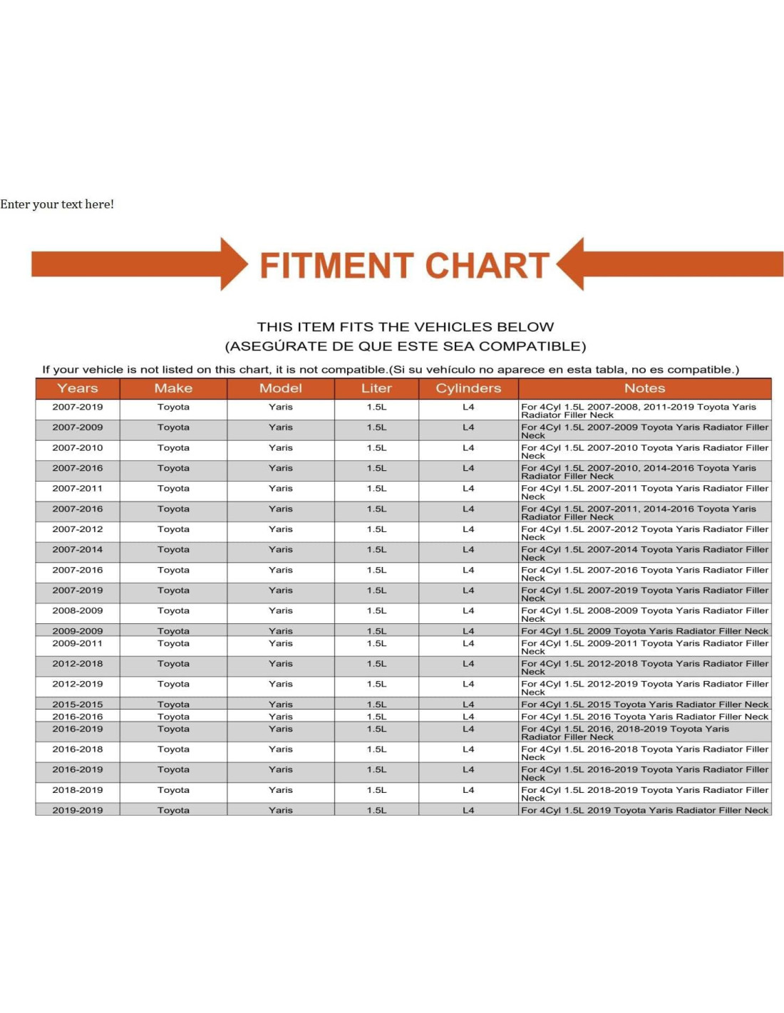 - Detalles de ajuste: Se adapta al radiador de cuello de llenado de 4 cilindros 1.5L 2016-2019 Toyota Yaris