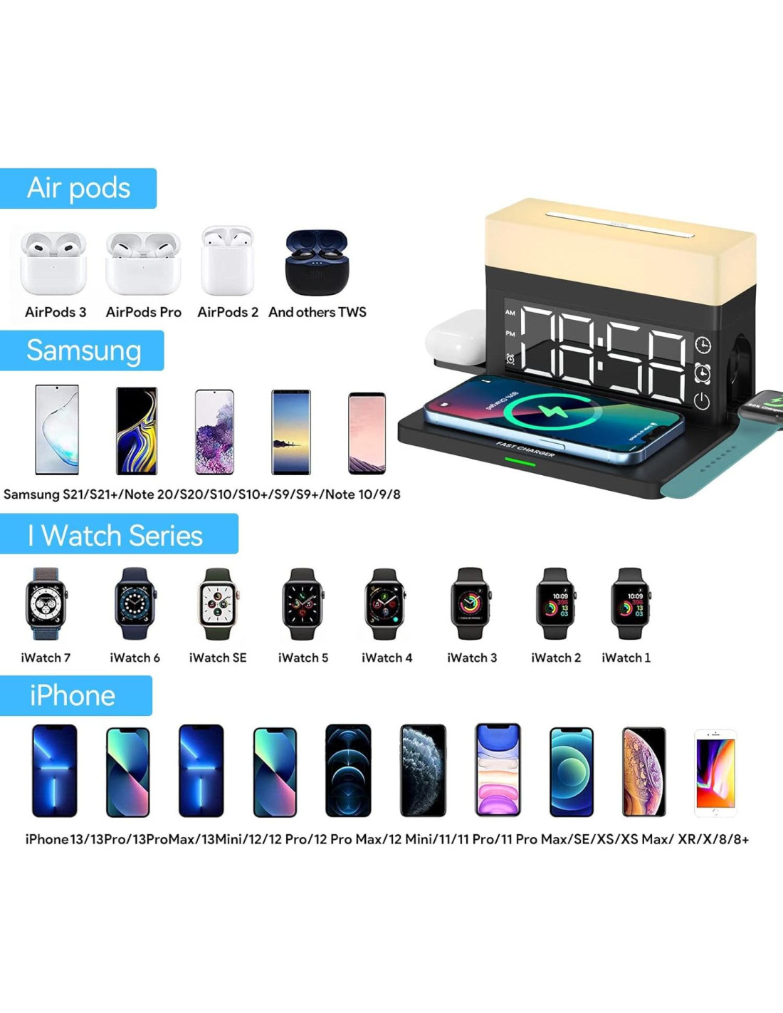 - [Estación de carga inalámbrica con reloj despertador Luz nocturna]: Adoptada la última tecnología inalámbrica qi 3.0, soporta cargar tu iPhone, Airpods, iWatch(el cargador inalámbrico de iwatch no incluido, No soporta para reloj samsung). La estación de carga de almacenamiento con agujero te ayuda a ocultar el cable, fácil de usar.