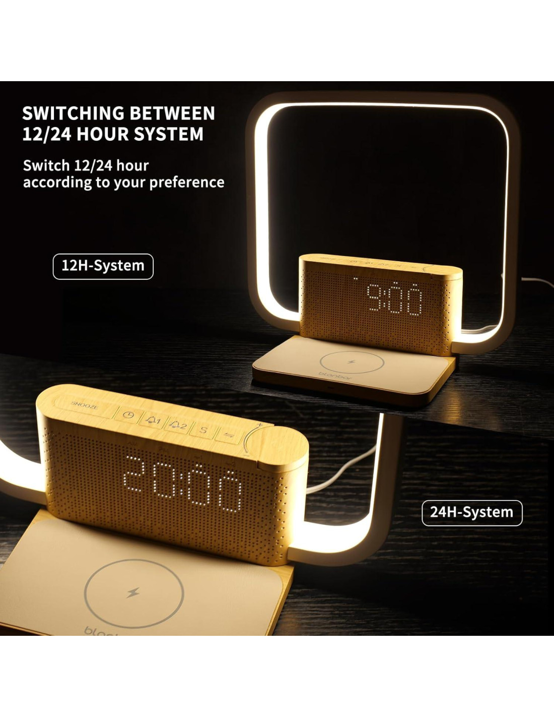 - Lámpara de mesa con cargador inalámbrico: Tenga en cuenta que el cuerpo debe estar perfectamente alineado con la base de carga inalámbrica al instalar, sin desviación de 1-2 mm. La luz nocturna blonbar tiene la función de carga inalámbrica para teléfonos o auriculares AirPods, coloque su dispositivo sobre la lámpara para cargar. Nota: asegúrese de que la lámpara esté conectada al cargador y que su teléfono sea compatible con la carga inalámbrica