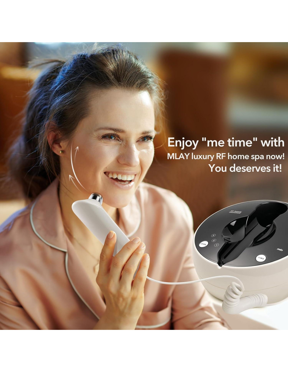 - Vibras de Spa en Tu Casa: ¡Evita citas costosas en el salón! La máquina de radiofrecuencia MLAY cuenta con 3 niveles de energía + 3 configuraciones de temporizador para un uso sin esfuerzo. Este dispositivo de mesa vive en tu tocador, úsalo por la noche mientras miras televisión. Disfruta de un masaje cálido y relajante que derrite el estrés mientras rejuvenece la piel, perfecto para rituales de autocuidado antes de dormir. Resultados en contornos faciales más firmes y patas de gallo minimizadas en 8-12 semanas. Consejo profesional: ¡Aplica tu suero favorito después del tratamiento!