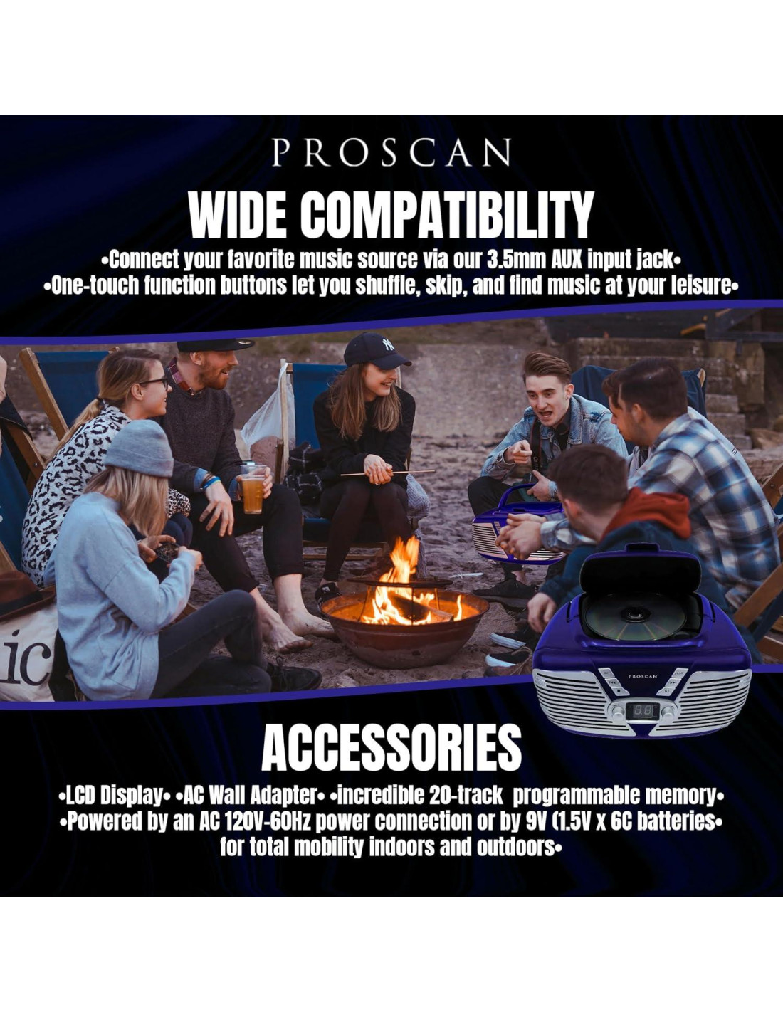 Proscan Elite Radio portátil reproductor de CD estilo retro. Radio retro. Con un atractivo diseño vintage adecuado para cualquier habitación, este producto combina encanto estético con funcionalidad completa, incorporando características de radio, CD y conexión AUX. Estas radios rivalizan con el sistema estéreo tradicional del hogar, lo que las hace ideales para varios entornos en el hogar, como un dormitorio, sala de estar o cocina. Los reproductores de CD Proscan Elite utilizan la última tecnología para proporcionar audio de alta calidad y garantizar un uso prolongado, tanto para niños como para adultos. Radio portátil reproductor de CD. Diseñado para uso múltiple con múltiples formas de escuchar tus melodías favoritas. Cambia sin esfuerzo entre la reproducción de CD, sintonizando tu estación de radio preferida y transmitiendo tu lista de reproducción más reciente. Amplía tus opciones de escucha conectando dispositivos externos a través de la entrada AUX. Lo suficientemente pequeño para un fácil transporte, su tamaño compacto y su asa plegable hacen que llevarlo sea muy fácil. Reproductor de CD con altavoz. Hecho para la simplicidad, estos boombox cuentan con un diseño de carga superior, botones y diales fáciles de usar en el panel frontal, con una pantalla LED clara para una operación sin esfuerzo. Equipado con altavoces de calidad estéreo de 3.5 pulgadas, ofrecen un sonido nítido y claro, permitiéndote cantar junto a tus canciones favoritas. Disfruta de audio personalizado con controles de volumen fáciles de usar, que te permiten ajustar el sonido a tu nivel preferido, ya sea que lo quieras alto o bajo. Características: - Radio AM/FM - Altavoces estéreo - Memoria programable de 20 pistas - Función de búsqueda/repetición - Entrada AUX - Asa plegable - Alimentación AC o a batería - Antena FM - Carga superior - Pantalla LED Especificaciones: - Salida de potencia de 1.2 vatios x 2 - Respuesta de frecuencia: 100 Hz a 12 kHz - Compatible con discos CD, CD-R, CD-RW