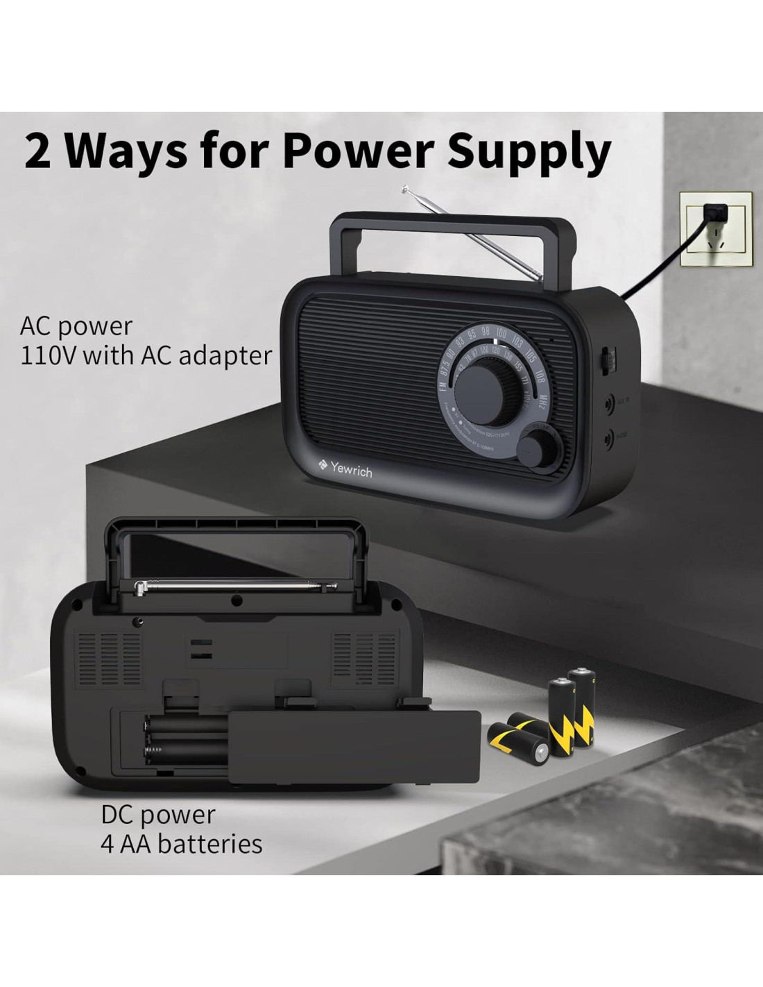 - Dos tipos de fuente de energía. Necesitarás corriente alterna de 110V para enchufar el cable de carga (incluido) en la pared y disfrutar de la radio todo el día en el dormitorio, cocina u oficina. Cuando estés al aire libre, inserta 4 baterías AA (no incluidas) en la radio alimentada por batería para que puedas conectarte y recibir noticias o música en tiempo real