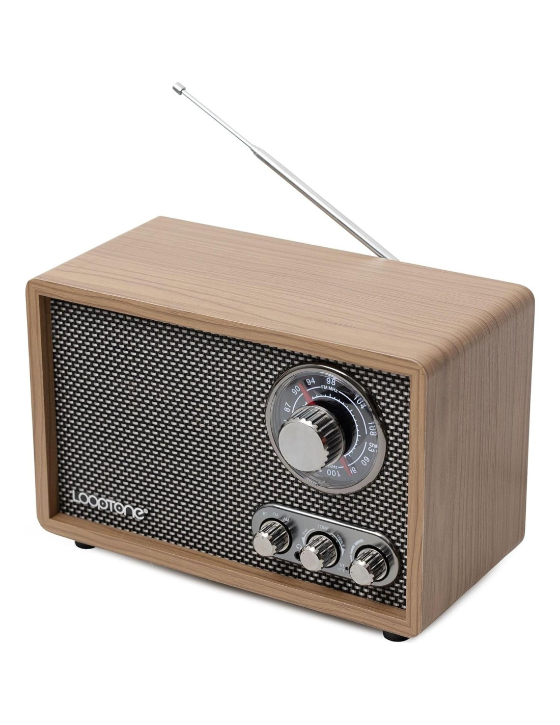 Soporta entrada AUX y entrada para auriculares. Emparejamiento inalámbrico bidireccional tanto Bluetooth dentro como fuera, con botones dedicados para cambiar, conveniente y práctico (gire el interruptor BTT en la parte posterior a OFF normalmente). Fuente de alimentación: 110V-120V CA 60HZ. Tamaño: 24cm*11.8cm*16cm (9.45in*4.65in*6.3in). Consumo de energía: 7W. Peso: 1.59kg (3.51lb). Altavoz: 4 5W. FM: 87.5-108KHz. AM: 530-1710KHz. Bluetooth: Dentro y fuera. Soporta dos frecuencias FM/AM. Selección de frecuencia por perilla, retro y hermosa. La luz del dial de sintonización asegura un control fácil incluso en la oscuridad. FM: 87.5-108 KHz. AM: 530-1710KHz (10KHz). Selección de funciones BT, FM, AM. Ajuste de tono, graves y agudos, elige el tono correcto para coincidir con el audio que se reproduce. El volumen y el interruptor de encendido están combinados en uno. Simple y fácil de usar.
