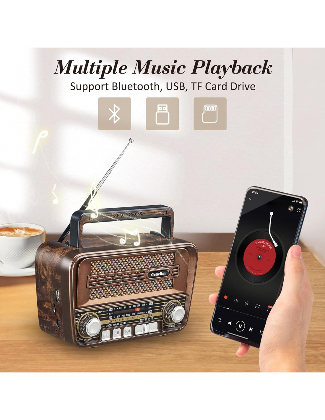 - [BLUETOOTH/USB/TARJETA TF] Cambia al modo "Música", la radio vintage soporta 3 formas de reproducir música o audiolibros. Con la avanzada tecnología Bluetooth 5.3, el altavoz Bluetooth retro es compatible con la mayoría de teléfonos, tabletas y laptops. La reproducción de unidades USB y tarjetas TF también está disponible, solo conecta y reproduce, sin operación complicada