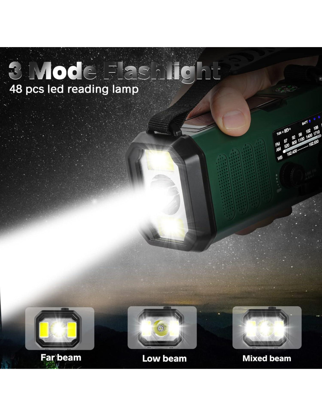 - Linterna de emergencia y alarma SOS super ruidosa: esta radio solar tiene 3 modos de linterna LED incorporados y 1.3 W de luz de lectura. Hay una sirena SOS y una brújula. La sirena SOS puede activar una alarma fuerte y puede ser escuchada a distancia para atraer rápidamente la atención y buscar ayuda. La brújula puede ayudarlo a no perderse.