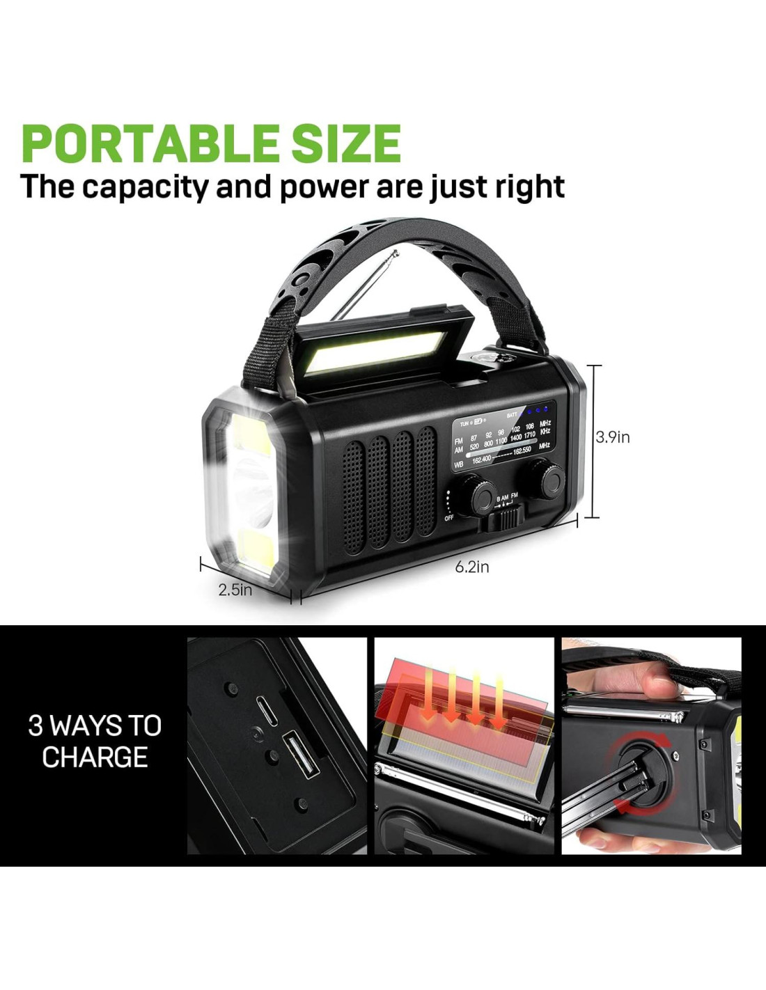 - 3 modos de carga - la radio de emergencia con batería de polímero de 10000 mAh incorporada no solo se puede cargar a través de un cable USB tipo C, sino que también puede alimentar la radio de emergencia a través de la manivela y los paneles solares para asegurarse de que pueda usar la radio de manivela normalmente en una emergencia.