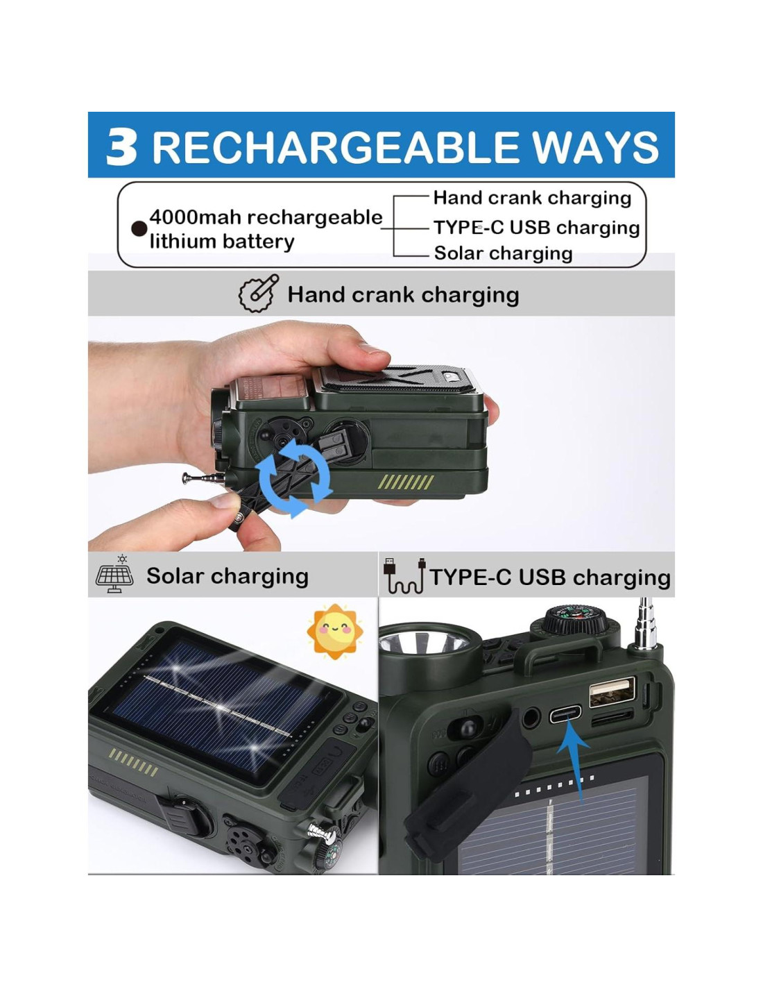 - [Tres Opciones de Carga] - La radio solar cuenta con un panel solar más grande, lo que permite cargarla con energía solar o USB-C. Cuando estés al aire libre, puedes utilizar la manivela para generar electricidad y alimentar la radio, lo que la hace muy adecuada para acampar, hacer senderismo y otras actividades al aire libre.