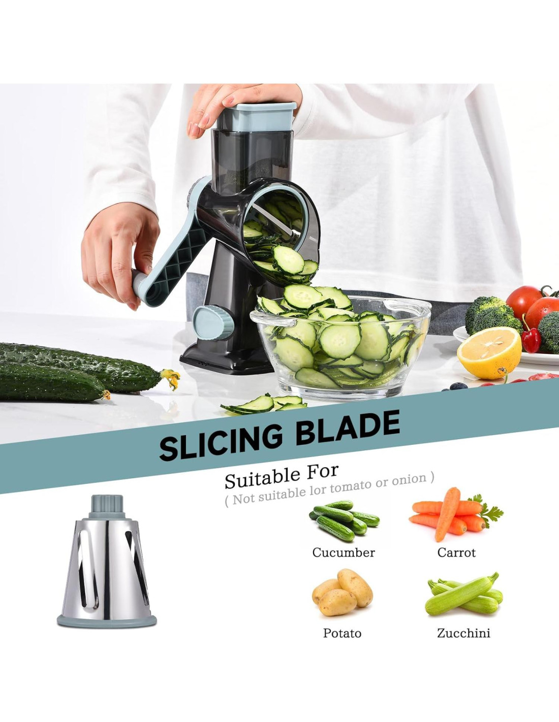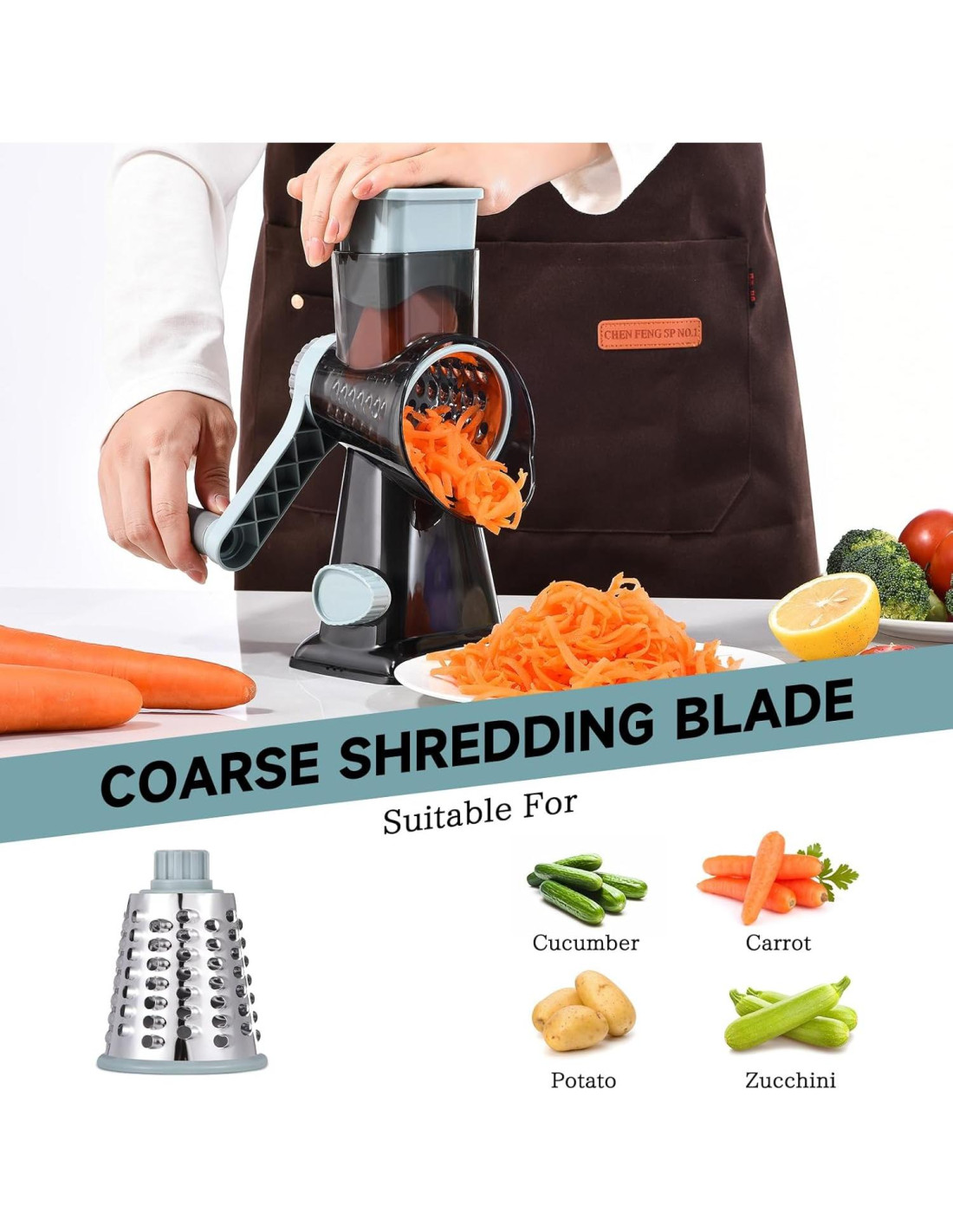 - [Rallador para Cocina] : [3-en-1 rallador de queso] Con 3 cuchillas de tambor para rebanar, rallar y moler varios ingredientes; Perfecto para queso, zanahorias, pepinos, papas, brócoli, chocolate, ensaladas y coberturas de pizza; Usa rebanar/grueso para queso blando, fino para queso duro.