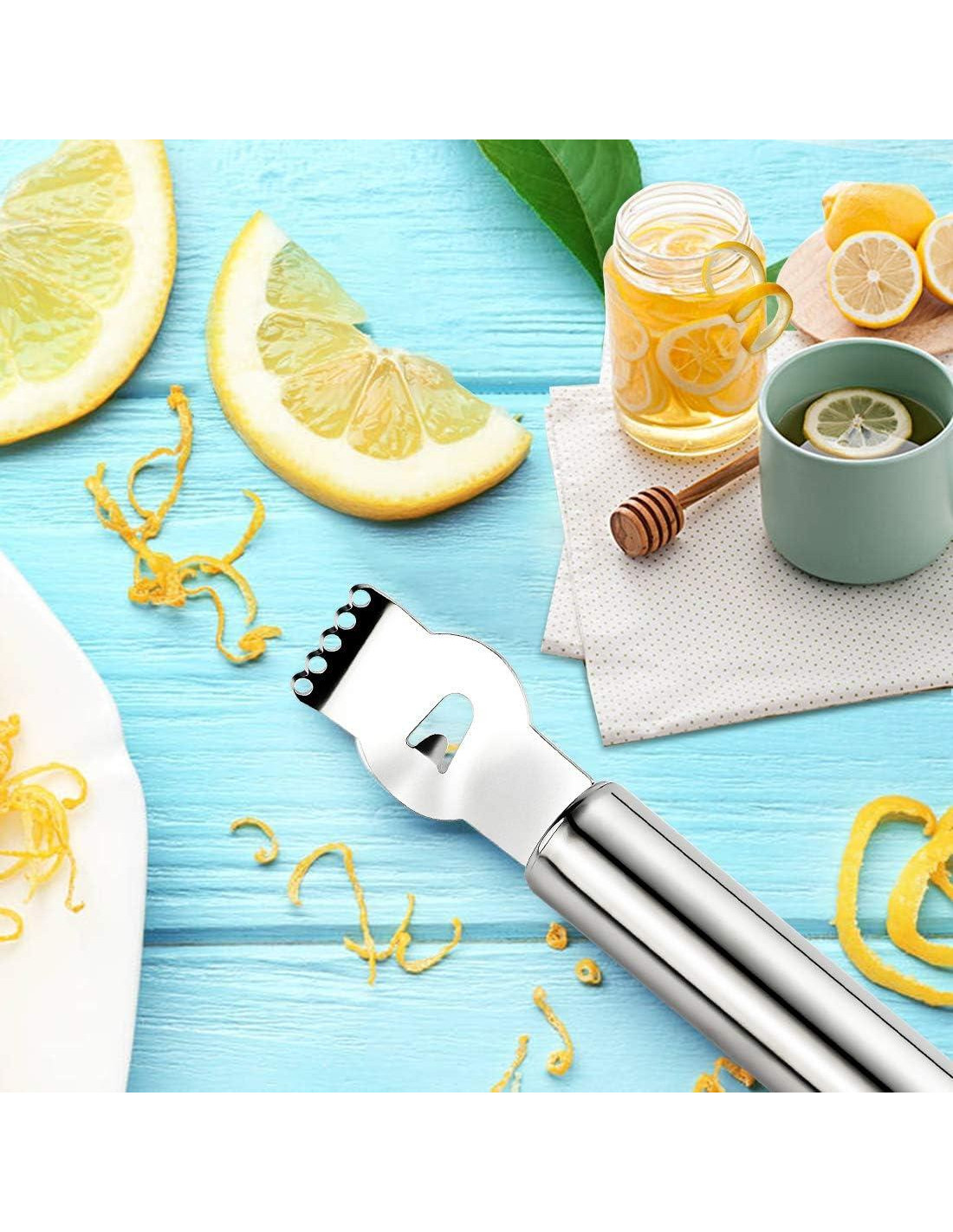 - 2 EN 1 PROPÓSITO: 2 usos en 1 utensilio, 5 agujeros afilados rallen fácilmente un limón al hacer pasteles; el cuchillo de canal incorporado hace algunas espirales de limón, giros de adorno hermosos;