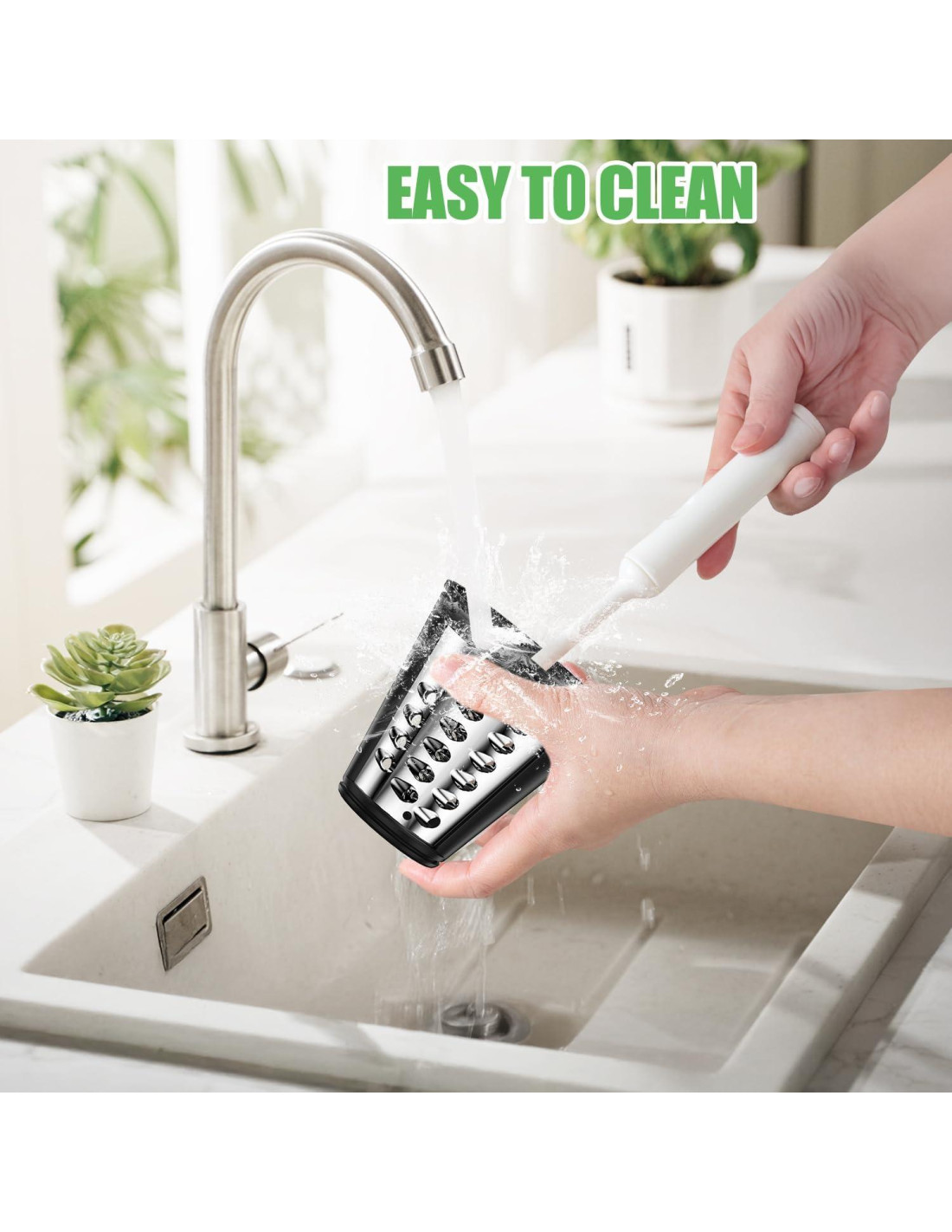 - [Fácil de Limpiar] Todas las partes del rallador de queso eléctrico son desmontables. La parte inferior del rallador de queso solo necesita ser limpiada con un paño húmedo y no debe ser sumergida en agua. Otras partes solo necesitan ser lavadas bajo agua corriente durante unos segundos, sin necesidad de pasos de limpieza engorrosos.