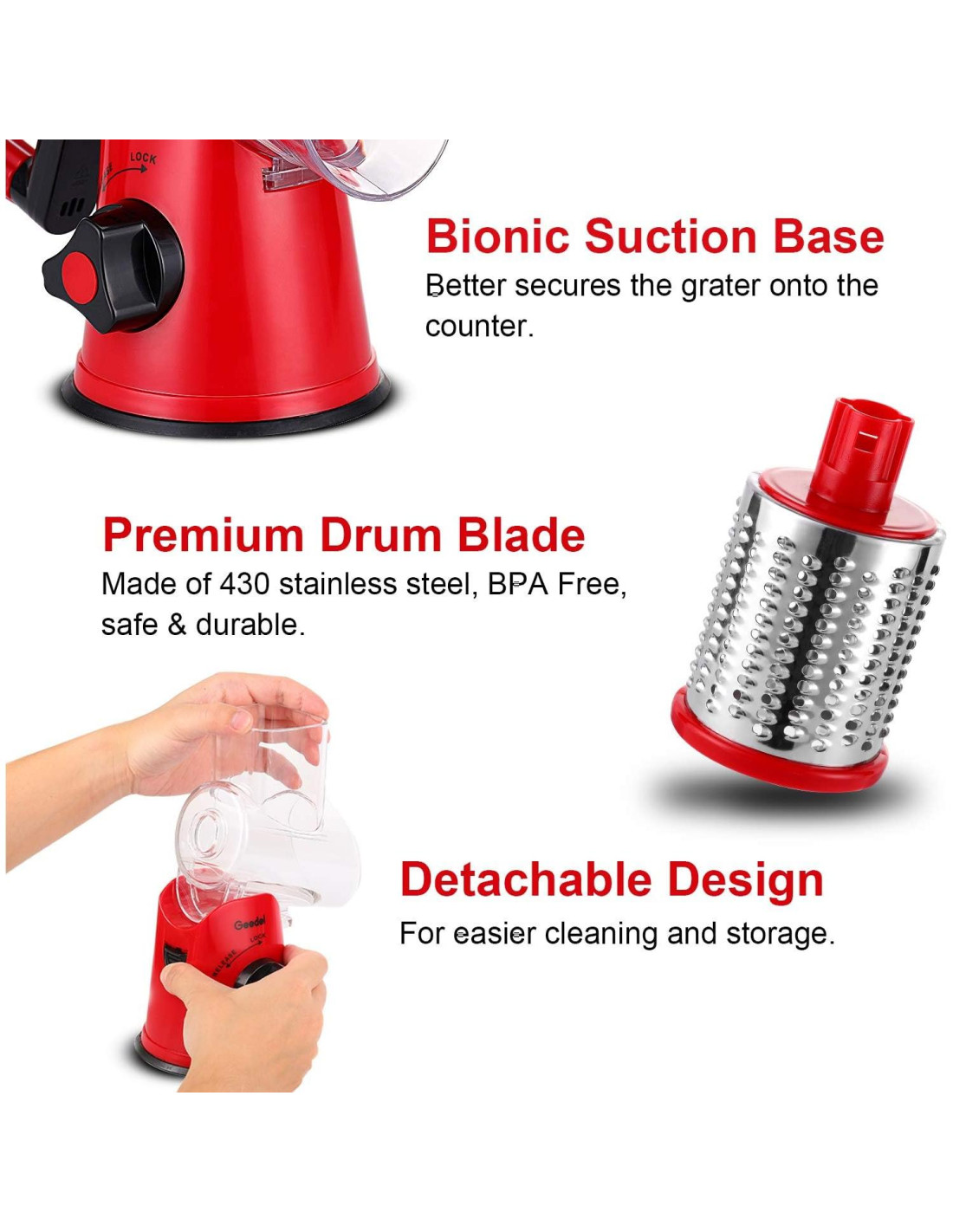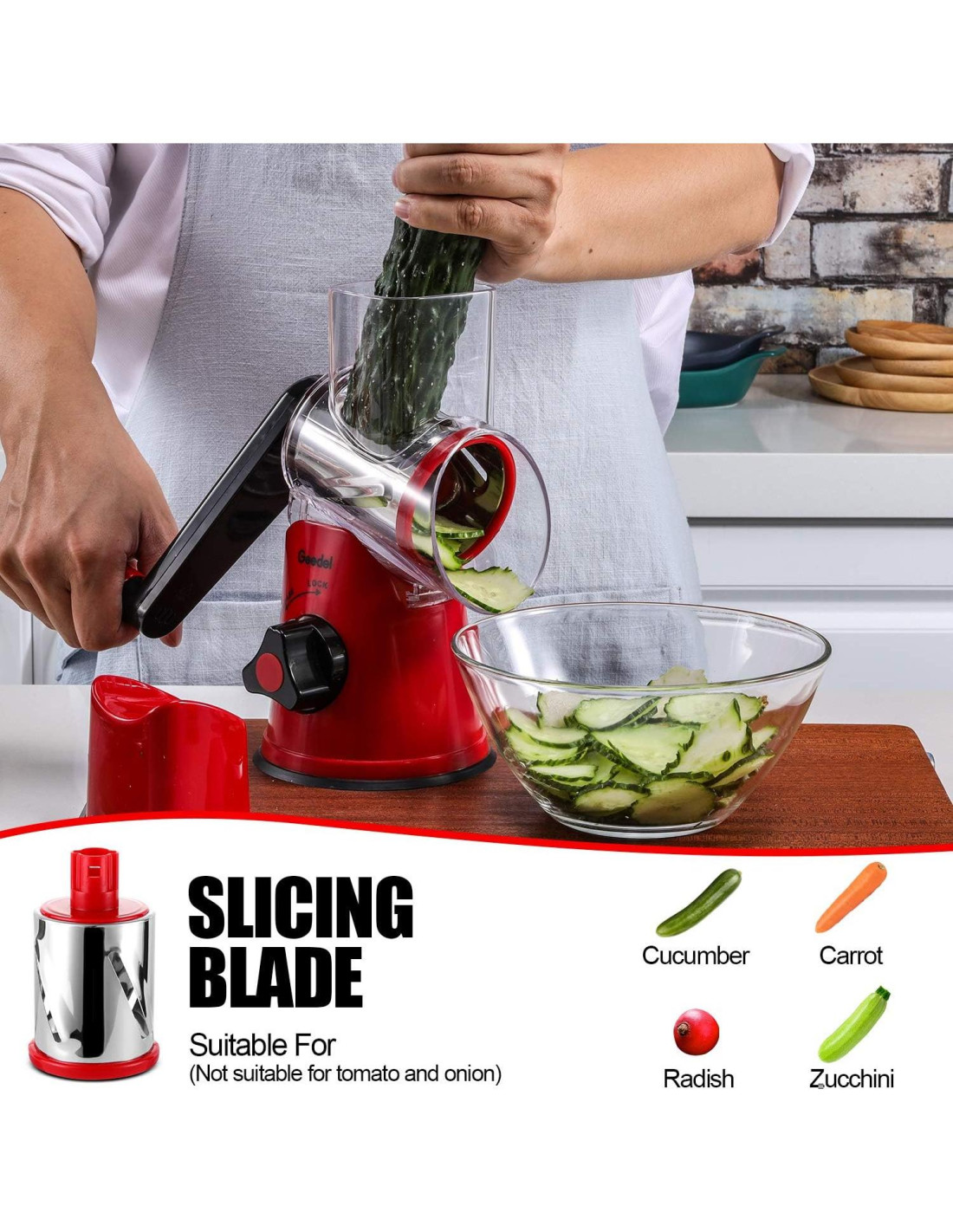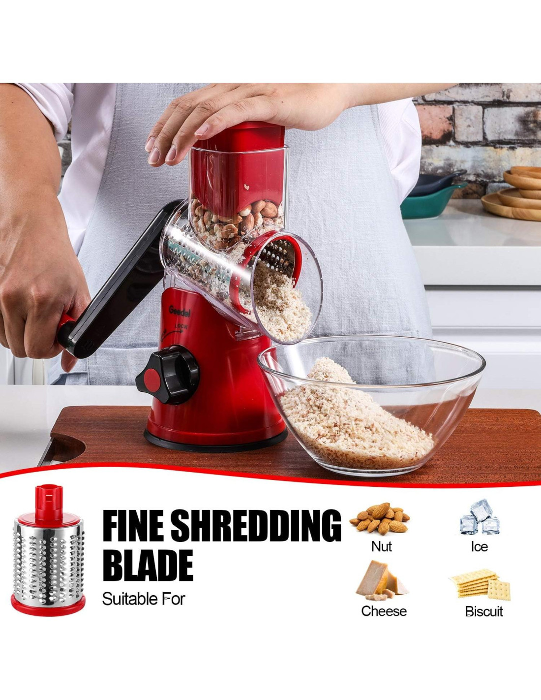 - Material Premium: Todas las partes del rallador de queso rotativo están hechas de material ABS de grado alimenticio, sin BPA. Las tres cuchillas están hechas de acero inoxidable, nunca se desafilan ni se oxidan. Nuestro rallador rotativo proporciona una opción segura y asegura que puedas disfrutar de comida saludable