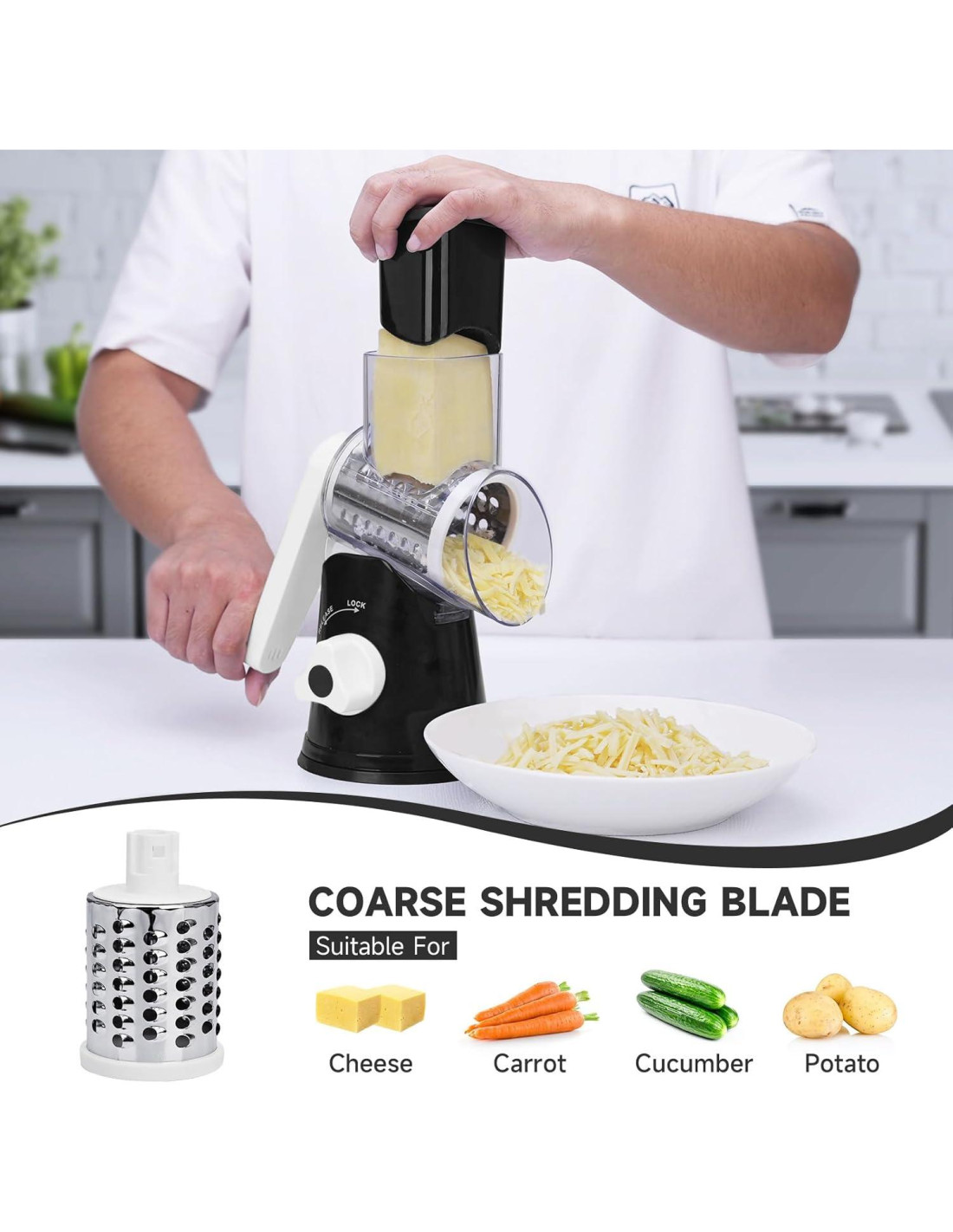 - [Compañero de Cocina Versátil] Simplifica tu preparación con nuestro versátil Rallador de Queso. Con 3 cuchillas intercambiables, conquista queso, verduras, nueces y más. No solo ahorra espacio valioso en la encimera, sino que también simplifica tu trabajo de preparación, haciendo que la hora de la comida sea un placer.