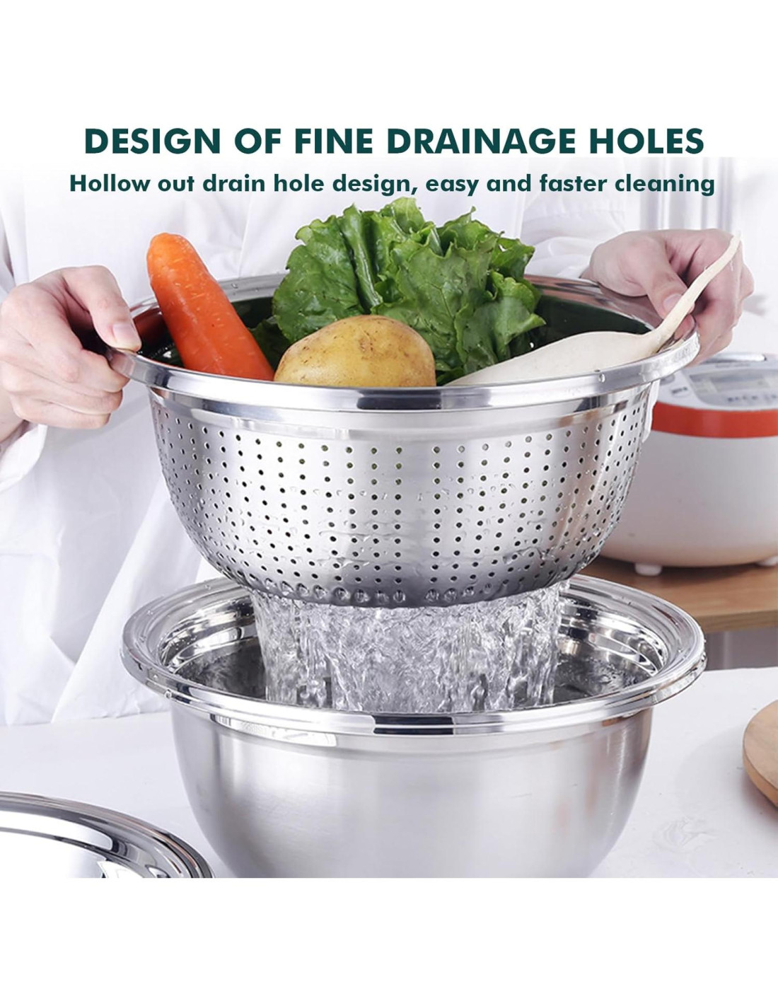 - Basin de Acero Inoxidable Multifuncional: el cortador de acero inoxidable 3 en 1 está hecho de material de acero inoxidable grueso de calidad. Al usar un rallador de cocina de acero inoxidable, no se doblará ni deformará fácilmente. Hay tres soportes fijos en la parte inferior del colador.
