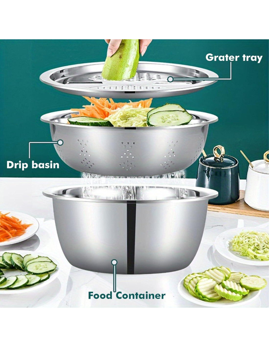 Basin de Acero Inoxidable Multifuncional, Basin de Acero Inoxidable Multifuncional, Set de Tres Piezas de Rallador de Acero Inoxidable, Cortador de Verduras 3 en 1 con Canasta de Drenaje Características: 1. El delicado colador asegura harina fina sin grumos. 2. Hecho de materiales aptos para alimentos, es apto para lavavajillas y fácil de lavar a mano. 3. Equipado con filtro/rallador/tazón, embellece tu cocina. Especificaciones: Nombre: Basin de Acero Inoxidable Multifuncional de Alemania Material: acero inoxidable Color: Plateado Tamaño: 28cm/11.02in Paquete Incluido: 1set * Basin de Acero Inoxidable Multifuncional (Bandeja de Drenaje*1 + Rallador*1 + Basin de Acero Inoxidable*1)