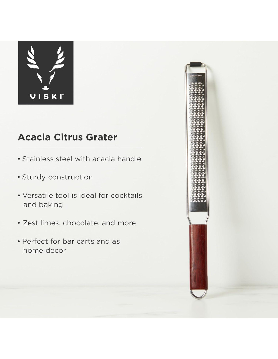 - MANGO DE MADERA DE ACACIA ESTILOSO PARA COMODIDAD - El mango de madera de acacia teñida ofrece un agarre cómodo y añade belleza atemporal a tu cocina o bar. Un rallador funcional que también sirve como herramienta decorativa para amantes de los cócteles.
