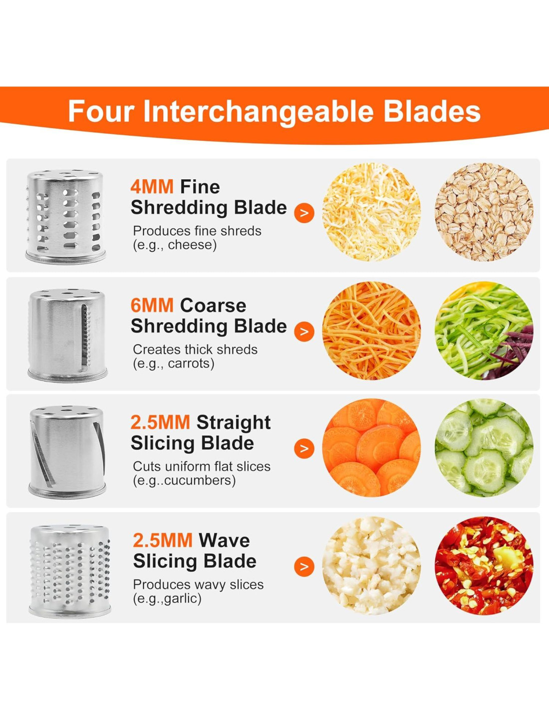 - Cuatro Cuchillas Intercambiables Equipado con cuatro cuchillas distintas, este accesorio proporciona versatilidad para diferentes necesidades de corte. Normalmente encontrará opciones para rallado fino, rallado grueso, corte delgado y corte grueso, lo que le permite lograr resultados precisos para cualquier receta