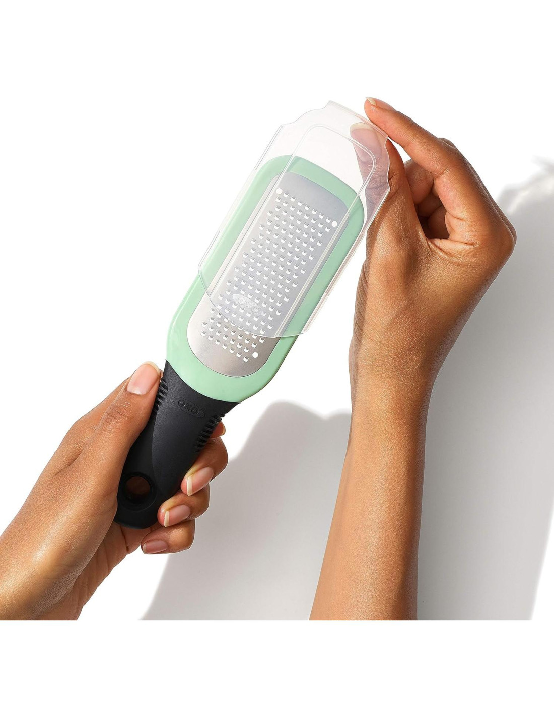 El Rallador de Jengibre y Ajo OXO Good Grips convierte eficientemente el jengibre fresco o los dientes de ajo en una pasta sabrosa para cocinar. Su superficie de acero inoxidable grabada se mantiene afilada por más tiempo, gracias a un proceso especial que afina el metal más finamente que el estampado tradicional. Los bordes de corte afilados permiten un rallado más rápido, incluso en ingredientes duros y densos. Este rallador de mano cuenta con dientes altos que lo hacen ideal para ingredientes fibrosos como la cúrcuma y el rábano picante. La base antideslizante y el mango suave y cómodo hacen que incluso la tarea más repetitiva sea casi sin esfuerzo, mientras que la conveniente tapa que se coloca mantiene la superficie y tus manos protegidas cuando no está en uso. La tapa también se duplica como un raspador que te permite obtener hasta el último trozo de pasta del rallador y en tu receta sin que su aroma se quede en tus manos durante el resto del día. Este rallador duradero es fácil de cuidar y apto para lavavajillas en la parte superior.