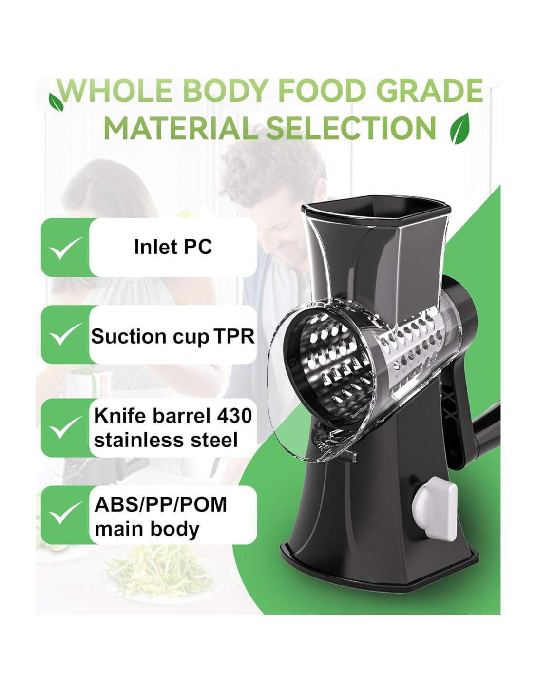 - Base de Succión Estable para Operación Segura: La succión integrada del rallador de queso proporciona un agarre sólido en encimeras lisas como mármol o vidrio. Esto asegura que el rallador se mantenga firmemente en su lugar mientras lo usas, eliminando cualquier preocupación sobre que se deslice durante la operación.