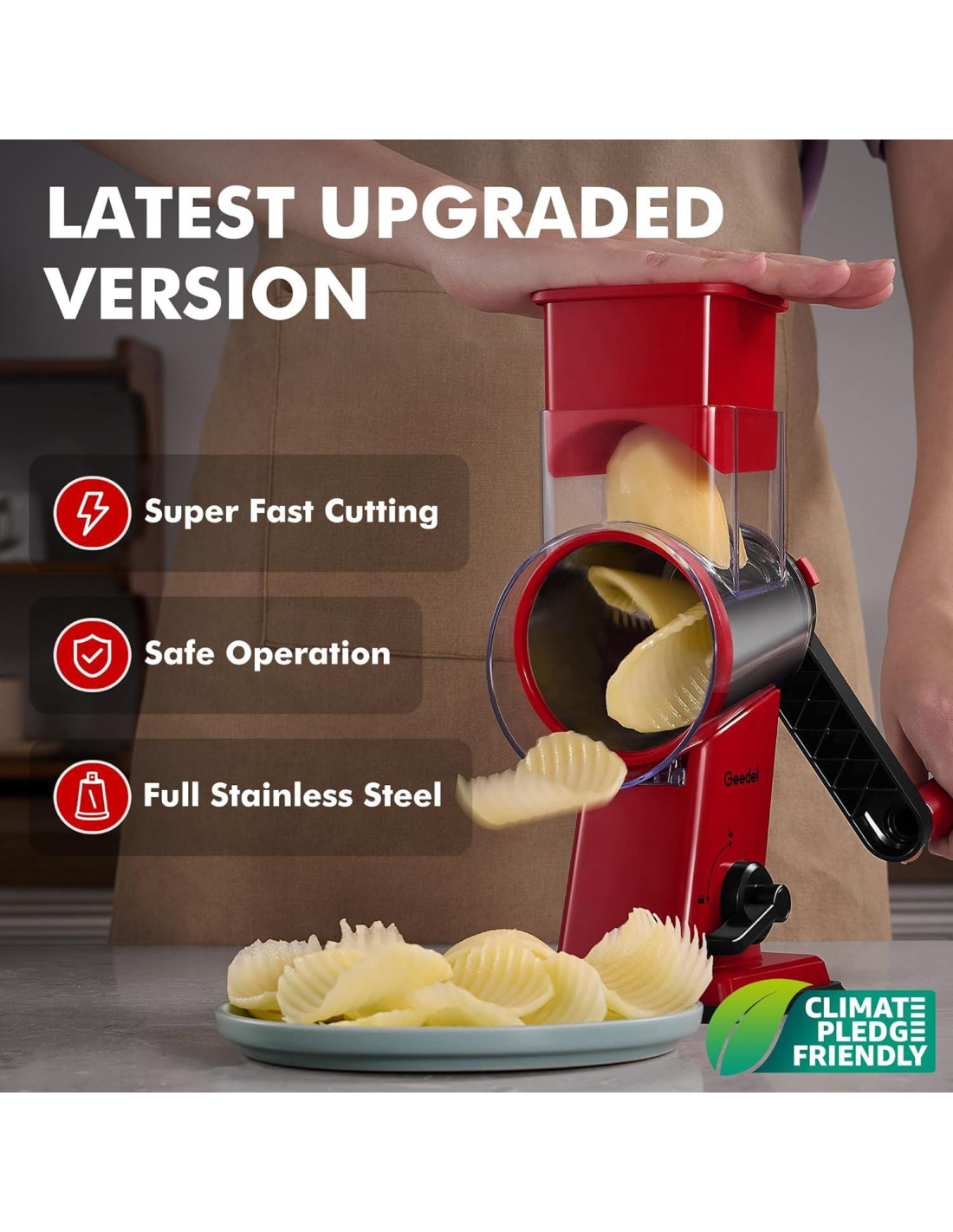 - Rallador Rotatorio de Cuchilla Ondulada Múltiple: Este rallador de verduras mejorado ahora incluye una nueva cuchilla de corte ondulada además de las tres cuchillas originales, ayudándote a crear rebanadas perfectamente onduladas para más de tus necesidades. Equipado con cuatro cuchillas intercambiables de acero inoxidable 430, este rallador de queso de manivela también incluye una cuchilla de corte, una cuchilla de rallado y una cuchilla de rallado fino además de la cuchilla de corte ondulada. El rallador de queso rotatorio es ideal para rallar queso, rábanos, nueces, papas, zanahorias, pepinos, calabacines y más.