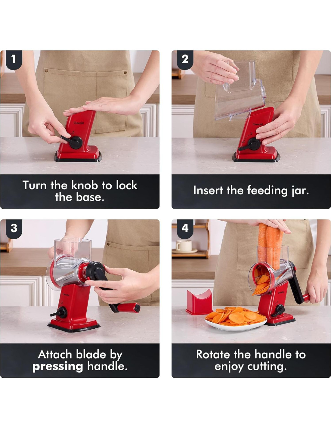 La abertura de alimentación más ancha, con una apertura un 40% más grande, facilita la inserción de verduras. Cuchilla más grande y afilada, 18 veces más rápida que un cuchillo. Reduce a la mitad tu tiempo de preparación. El mango mejorado con dos botones asegura un agarre más seguro y mayor robustez. Base más grande y succión más fuerte se mantiene estable y segura. ¿Qué diferencia al modelo mejorado de versiones anteriores? ¡El rallador de queso recibe una mejora completa! El frasco de alimentación está más inclinado, la variedad de cuchillas es mayor y más, la base es más robusta, todo lo cual hace que el rallador sea más fácil y eficiente de operar, ahorrándote la mitad del tiempo. ¿Es el rallador de queso apto para lavavajillas? Sí, recomendamos que sea apto para la parte superior del lavavajillas. Consejos: limpiar el mango y la base con un paño seco extenderá la vida útil del rallador. ¿Cuál es la fuerza de succión de la base del rallador? Después de la mejora, la base es más grande y más estable, y el botón es más suave, lo que permite una operación más fácil y sin esfuerzo. ¿Qué tipo de queso se puede rallar? El rallador de queso es ideal para Parmesano, Cheddar, Mozzarella, Romano, Mascarpone, Gouda y más. Y puedes elegir la cuchilla según lo fino que prefieras rallar. ¿Es este rallador desmontable? Sí, este rallador es completamente desmontable. Simplemente presiona el botón rojo en el mango para separarlo del tambor de la cuchilla, y presiona el botón negro cerca de la base para quitar la taza transparente, haciendo que el desmontaje sea rápido y fácil. Rallador de Queso Rotatorio Rallador de Queso Picador de Alimentos Procesador de Alimentos Manual Cortador de Mandolina Picador de Alimentos a Mano Cortador de Papas Fritas.