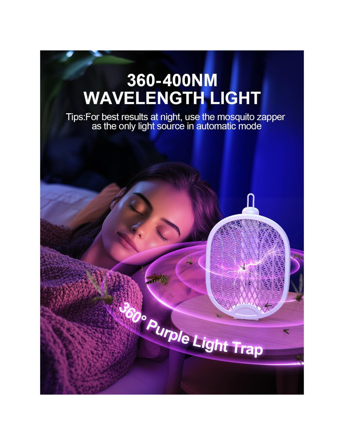 - Modo dual: Cambia fácilmente entre el modo manual y el modo automático. En modo automático, la luz azul incorporada (360-400nm de longitud de onda) atrae a los mosquitos sin esfuerzo, convirtiendo tu raqueta eléctrica para moscas en un matamoscas manos libres. Perfecto para protección de día o de noche.