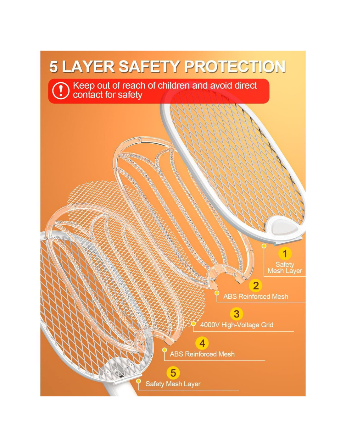 - Protección de seguridad de 5 capas: Nuestra raqueta eléctrica para moscas cuenta con una malla de seguridad de cinco capas, con la red eléctrica activa aseguradamente intercalada entre dos capas aislantes. Este diseño cuidadoso protege contra toques accidentales, manteniendo a salvo a niños, mascotas y toda la familia.