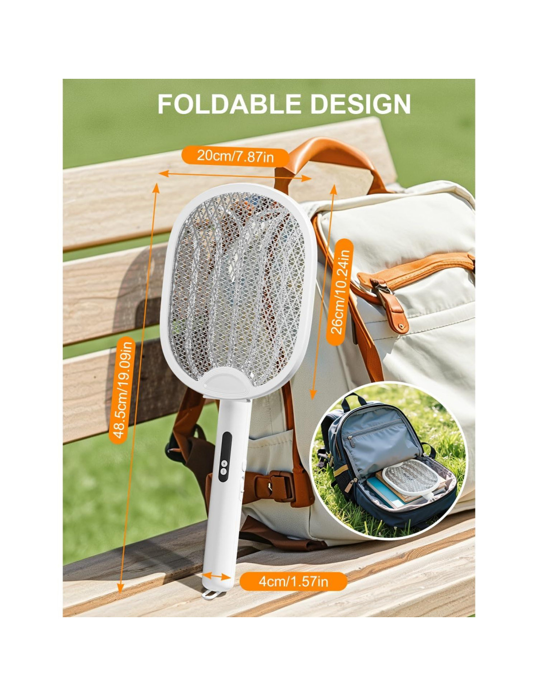 - Mango plegable de 180: Lleva tu raqueta eléctrica para moscas a cualquier lugar. El diseño del mango plegable y rotatorio la hace lo suficientemente compacta como para deslizarla en tu bolsa - perfecta para acampar, hacer senderismo, barbacoas en el patio trasero y más.