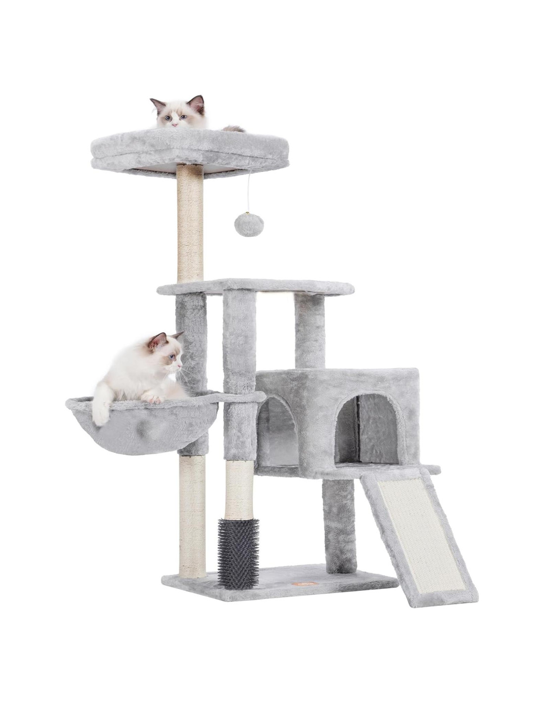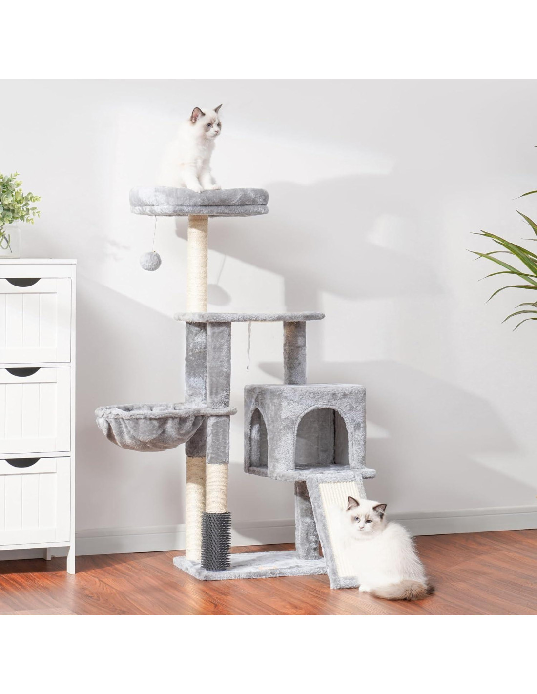 - Cepillo de Autocuidado para Gatos: El árbol para gatos tiene un diseño de autocuidado en el nivel inferior, el cepillo de plástico suave ofrece a los gatos un masaje y cuidado suave y ayuda a eliminar y recoger sus pelos, lo que no solo es beneficioso para la salud del gato, sino que también crea un ambiente limpio para ti y tu familia