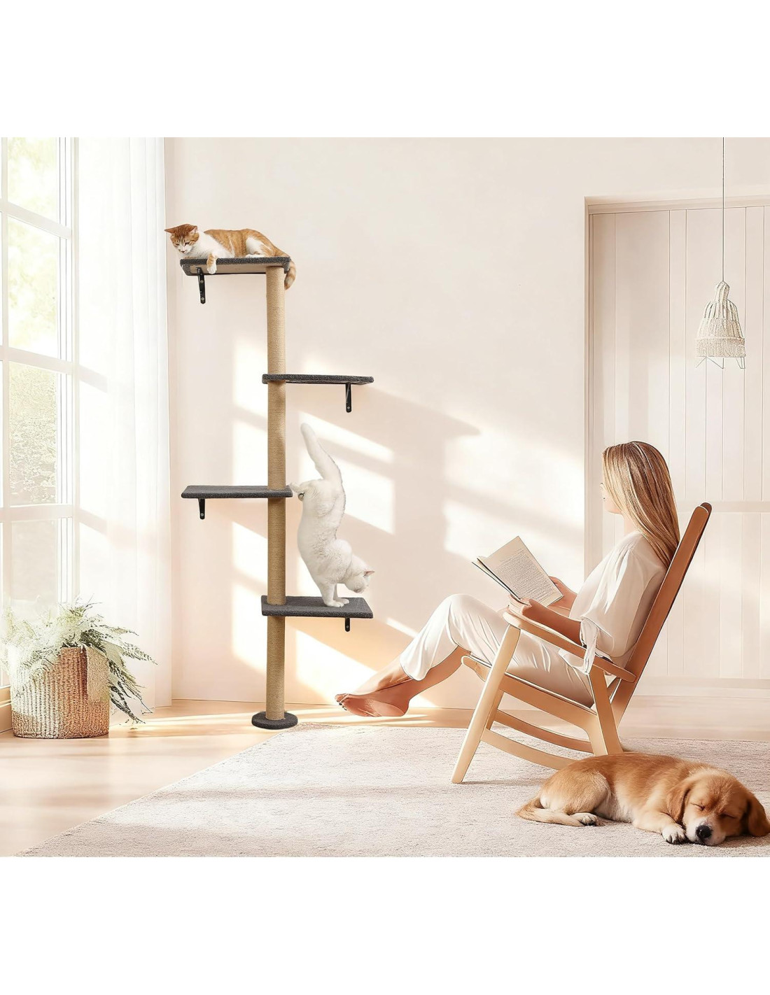 - 4. Uno para Todos los Encuentros Diarios - Los postes de pared para gatos de 4 niveles con sisal premium ofrecen un lugar para rascar, estirarse, escalar y dormir. Los gatos a menudo eligen diferentes alturas para descansar según su estado de ánimo: lugares más altos para observar, niveles intermedios para relajarse o espacios cerrados para un sueño profundo.