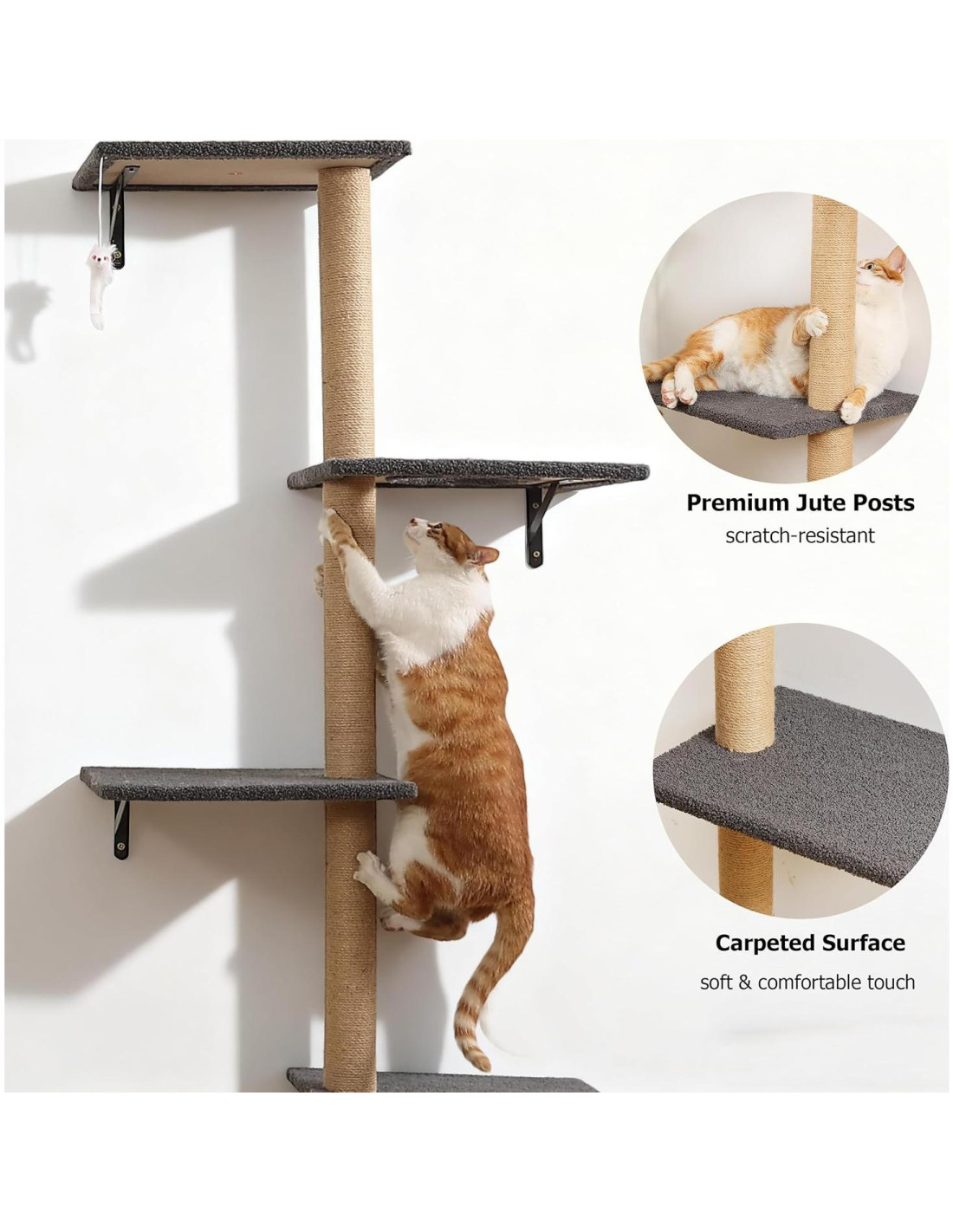 - 2. Parque Infantil para Gatos Robusto y Seguro---- La torre para gatos montada en la pared con soporte de hierro ofrece a los gatos un soporte estable para escalar y jugar. Y las plataformas alfombradas proporcionan un agarre superior para prevenir resbalones, incluso durante los saltos más salvajes, brindándoles una mayor sensación de seguridad.
