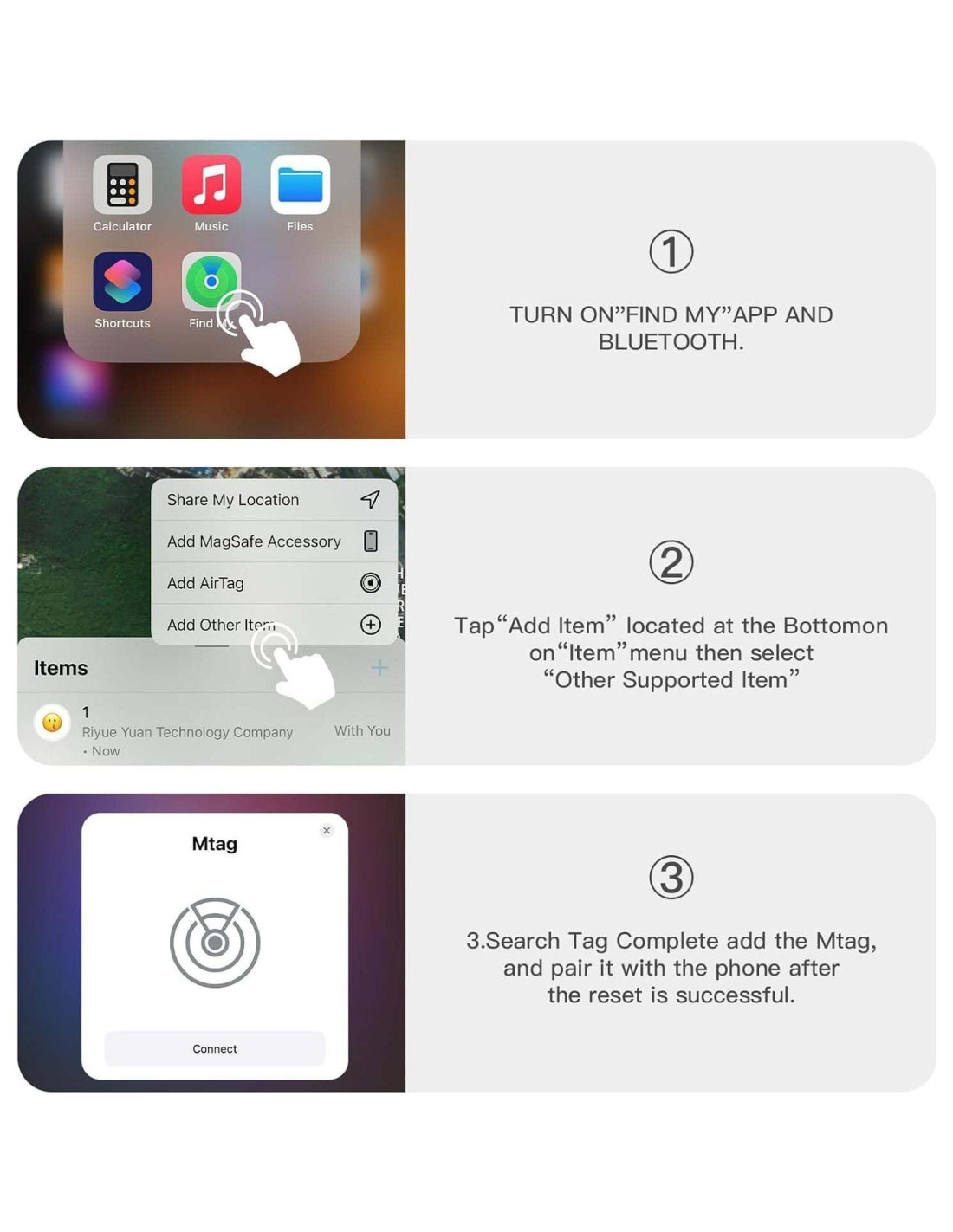 - [Pasos para Conectar a la APP 'Encontrar Mi'] Enciende Bluetooth, abre la APP 'Encontrar Mi'-artículo-agregar artículos-otros artículos compatibles-Conectar etiqueta.