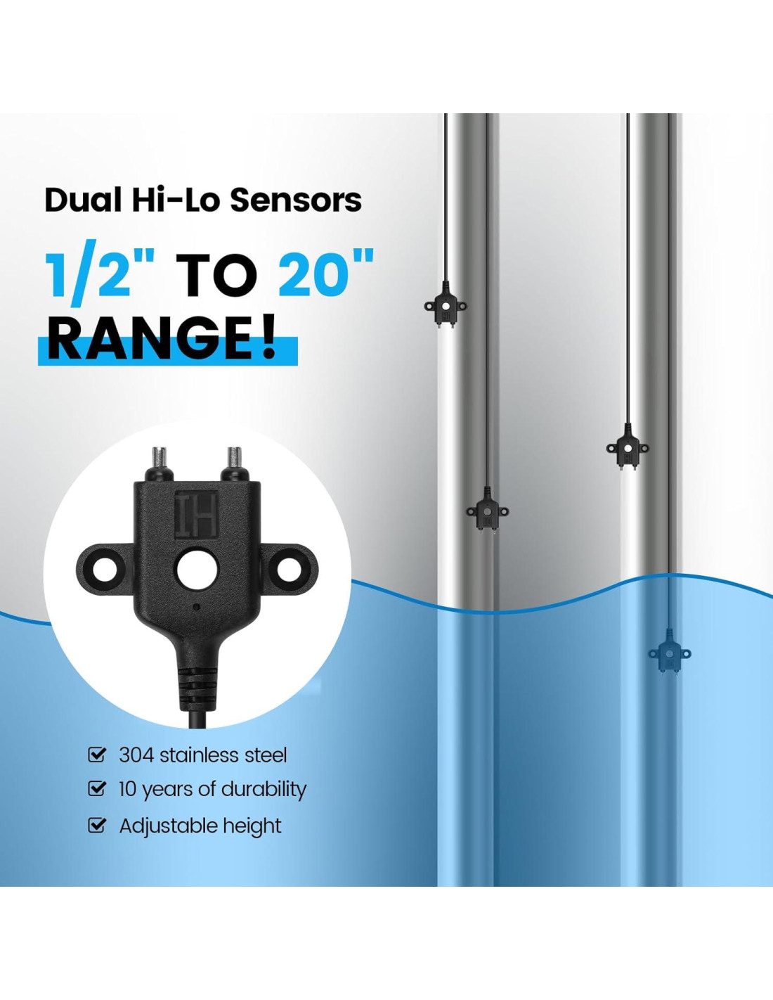 - DURABILIDAD DEL SENSOR Y FIABILIDAD MECÁNICA: El controlador de bomba Ortis cuenta con sensores hi-lo con una durabilidad patentada de detección de nivel de agua de 10 años. Fabricados con acero inoxidable 304 robusto, estos sensores resistentes a la corrosión son ajustables para un rendimiento óptimo de la bomba de aguas residuales. Abordando las desventajas de los interruptores de flotador mecánicos, este controlador compacto y duradero asegura fiabilidad sin partes móviles en el pozo, extendiendo la vida útil de tu bomba de aguas residuales.