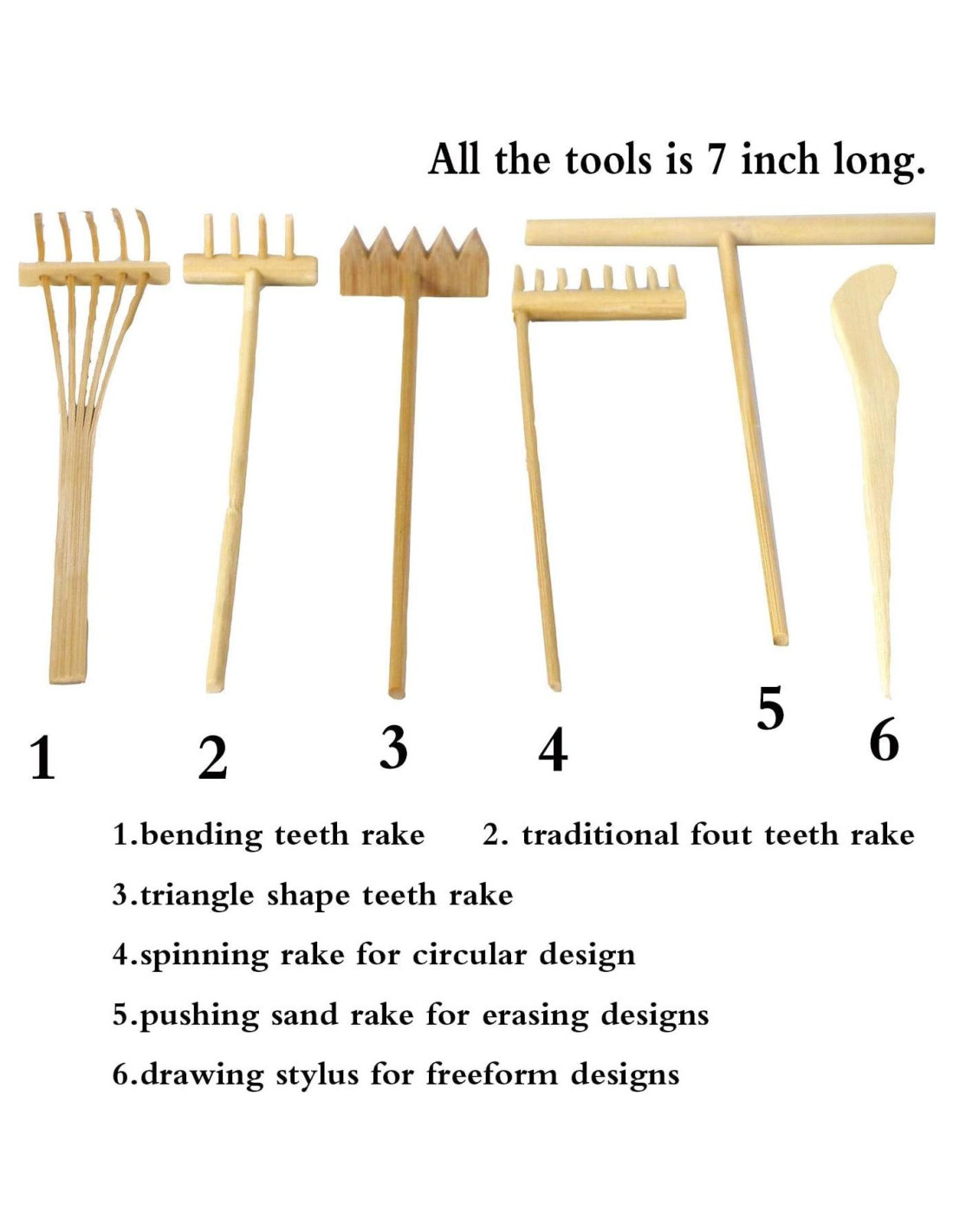 - Sistema de diseño completo - Crea curvas, líneas, geometría y arte a mano alzada. 1pc rastrillo tradicional de cuatro dientes, 1pc rastrillo de dientes en forma de triángulo, 1pc rastrillo giratorio para diseño circular, 1pc rastrillo para empujar arena para borrar diseños, 1pc estilógrafo para crear formas de arena libres